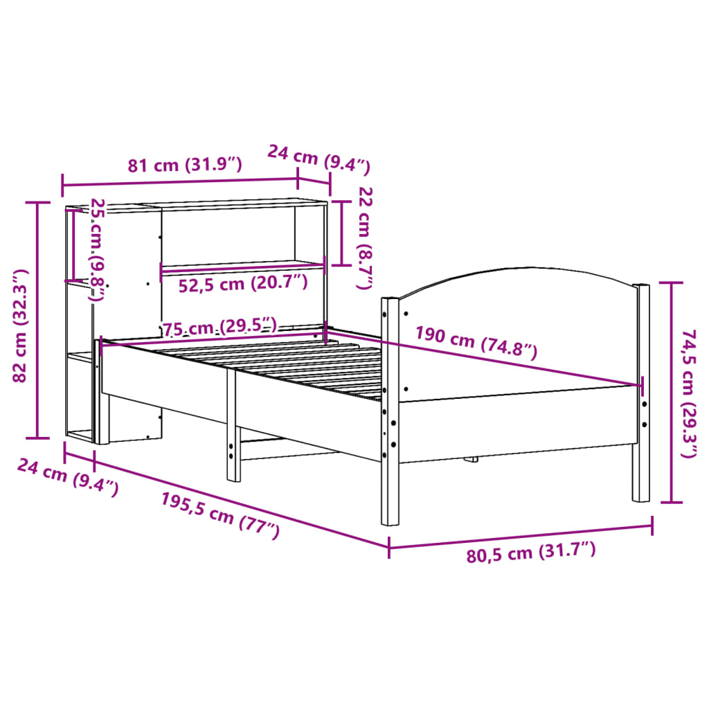 Sänky kirjahyllyllä ilman patjaa 75×190 cm täysi mänty
