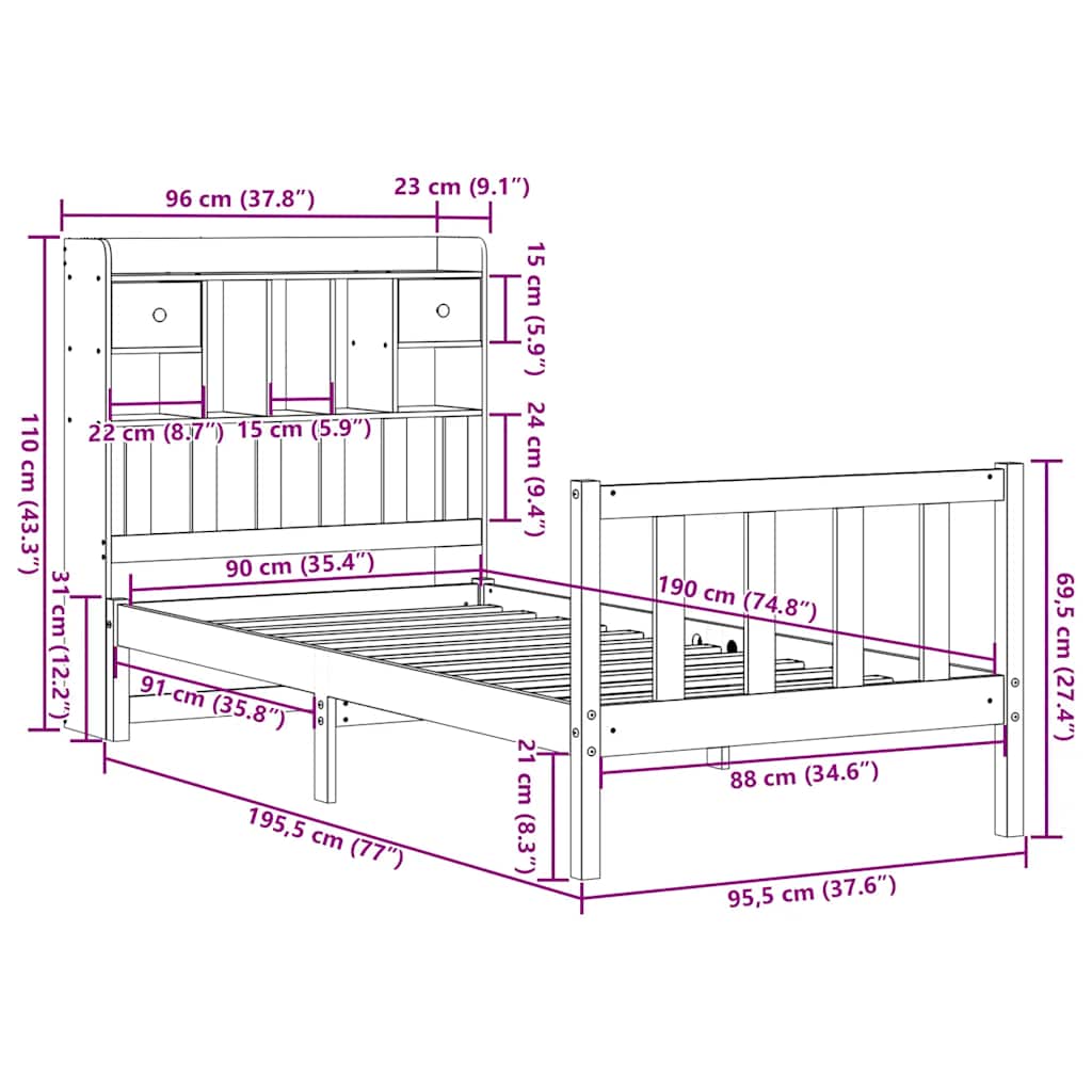 Sänky kirjahyllyllä ilman patjaa 90×190 cm täysi mänty