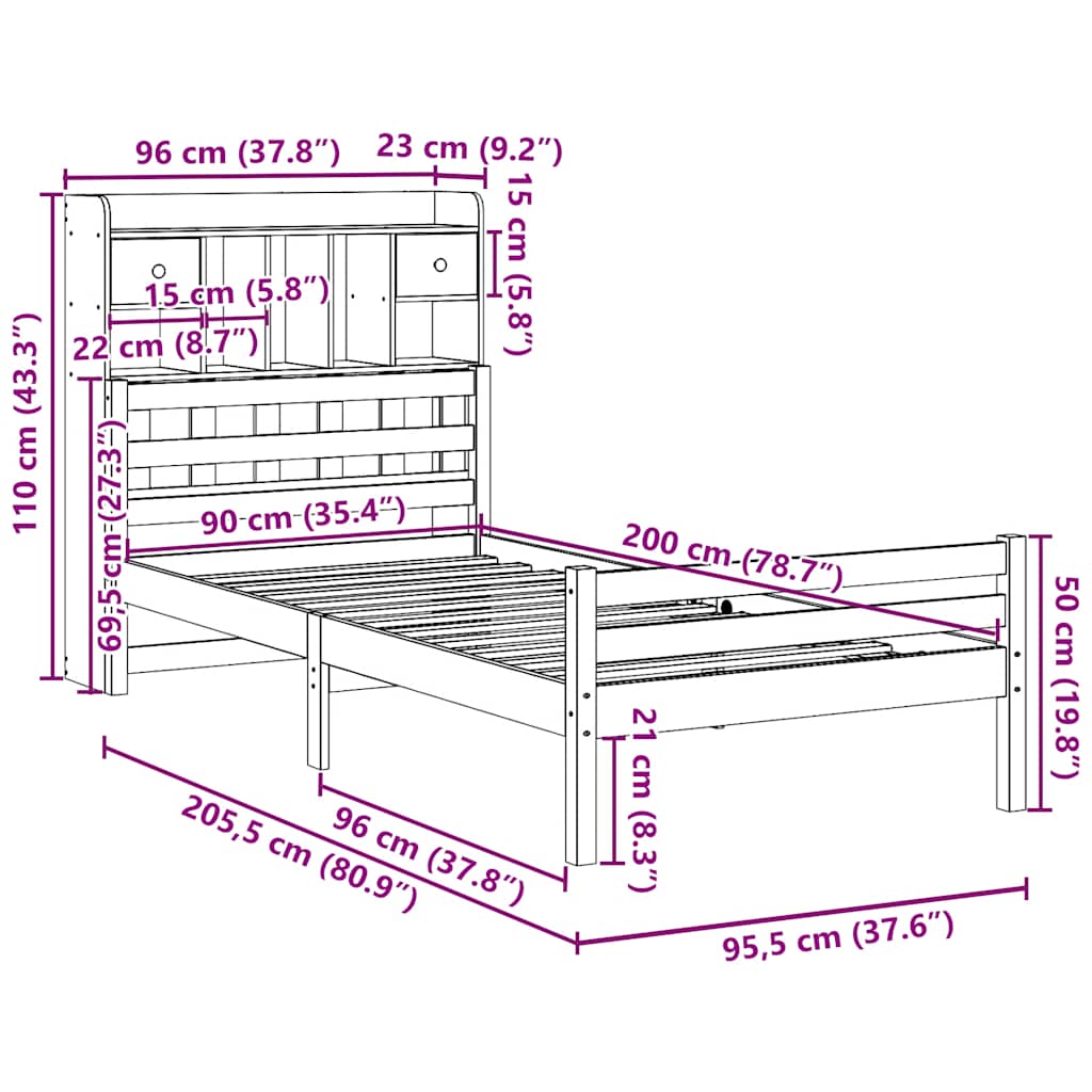 Sänky kirjahyllyllä ilman patjaa 90×200 cm täysi mänty