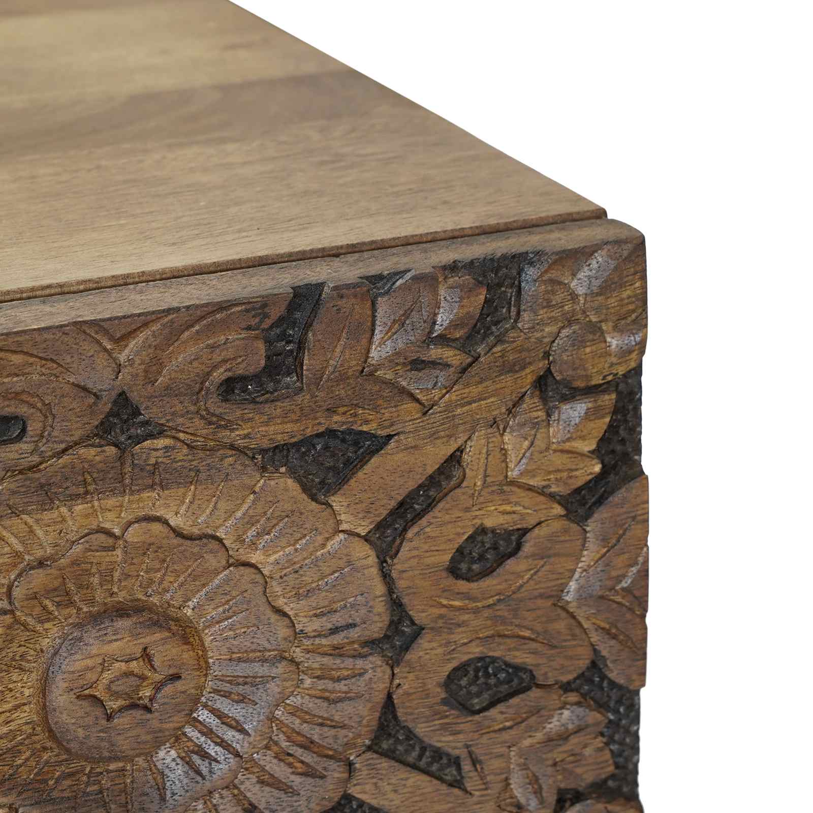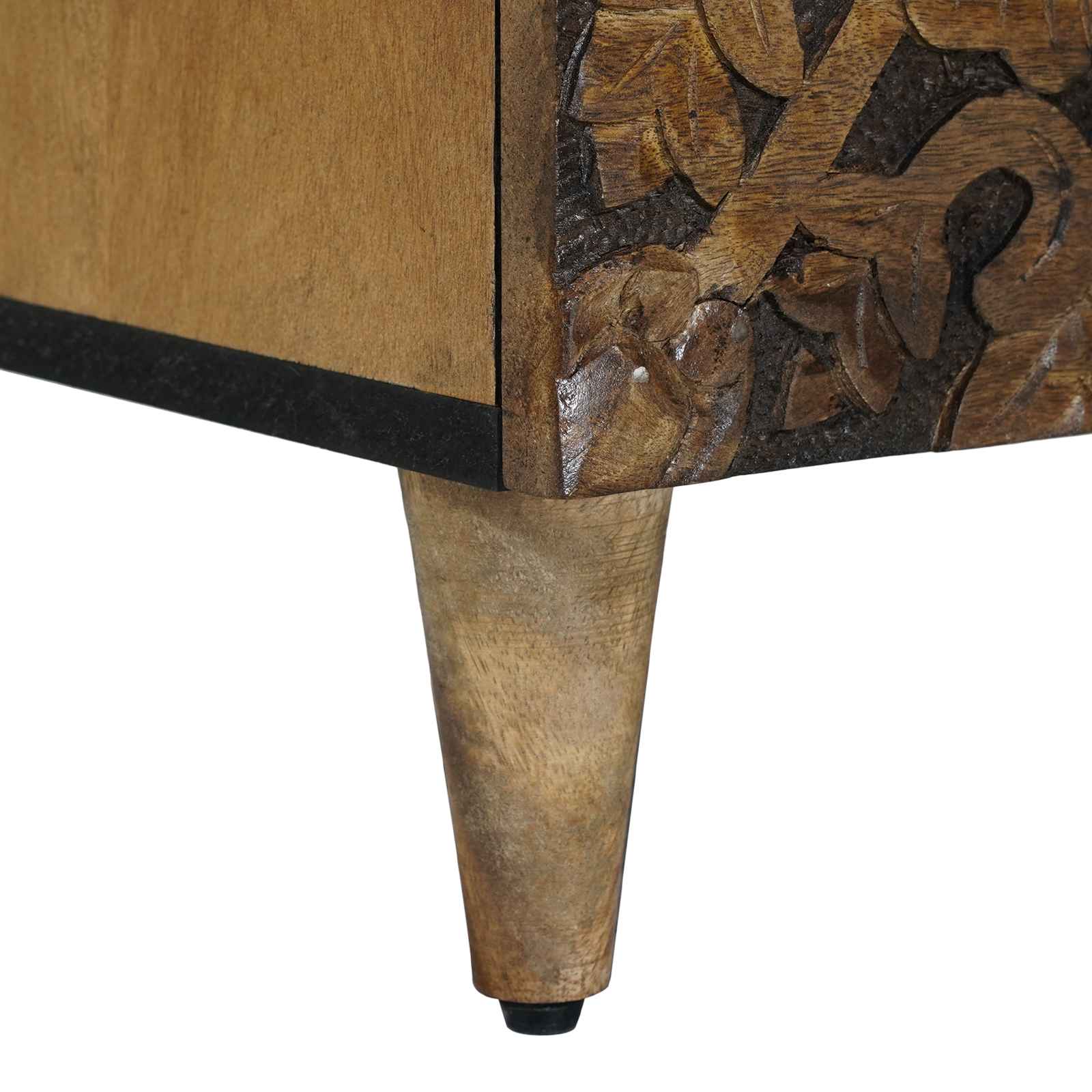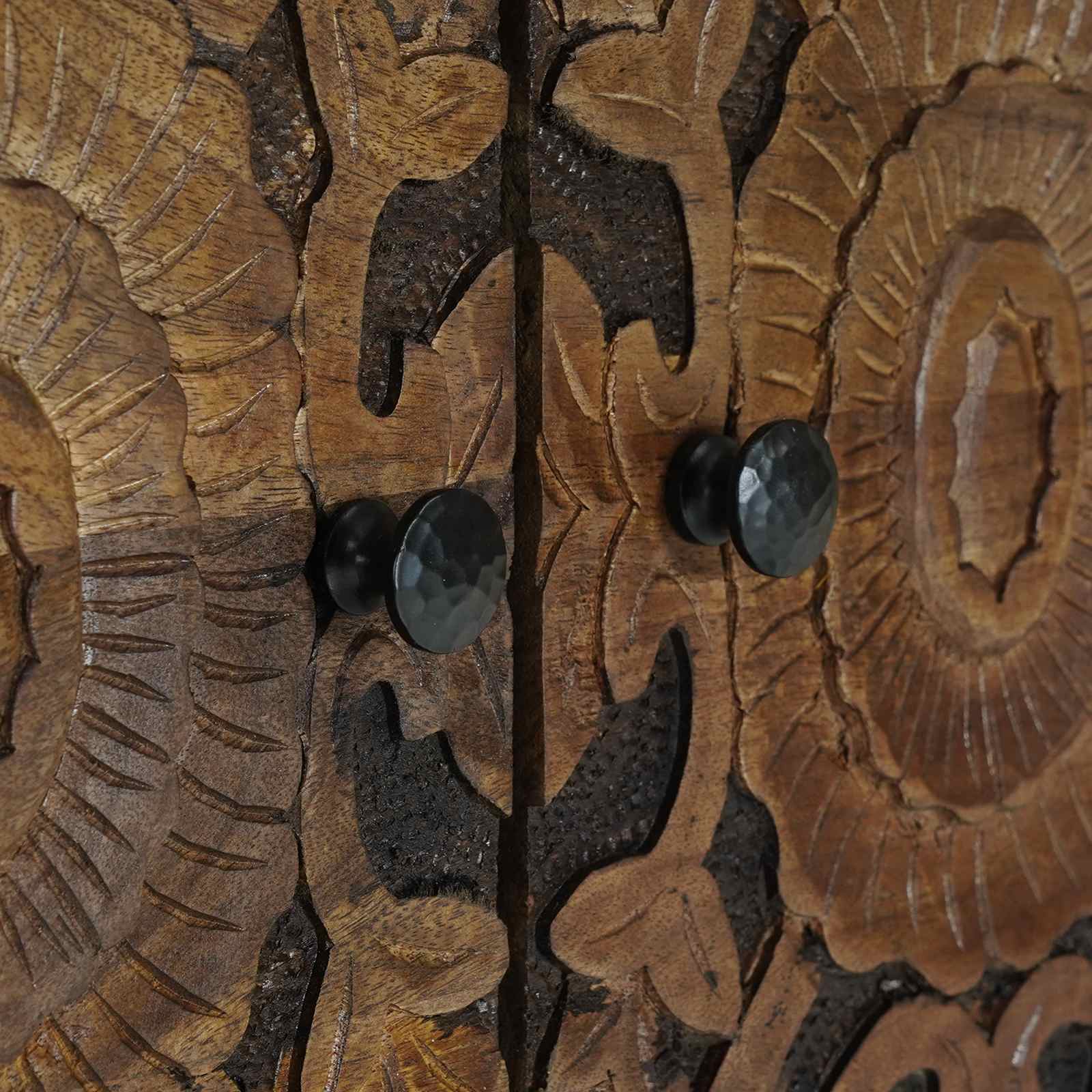 • Tyylikäs Täysi Mangopuu: Koko kaappi on valmistettu Täydestä Mangopuusta, valittuna kestävyytensä ja kauniin ulkonäkönsä vuoksi. Tämän materiaalin avulla jokainen kaappi on ainutlaatuinen, koska mangopuun tekstuurit ja värit vaihtelevat. Mangopuun kestävyys tekee siitä suositun valinnan huonekaluissa.