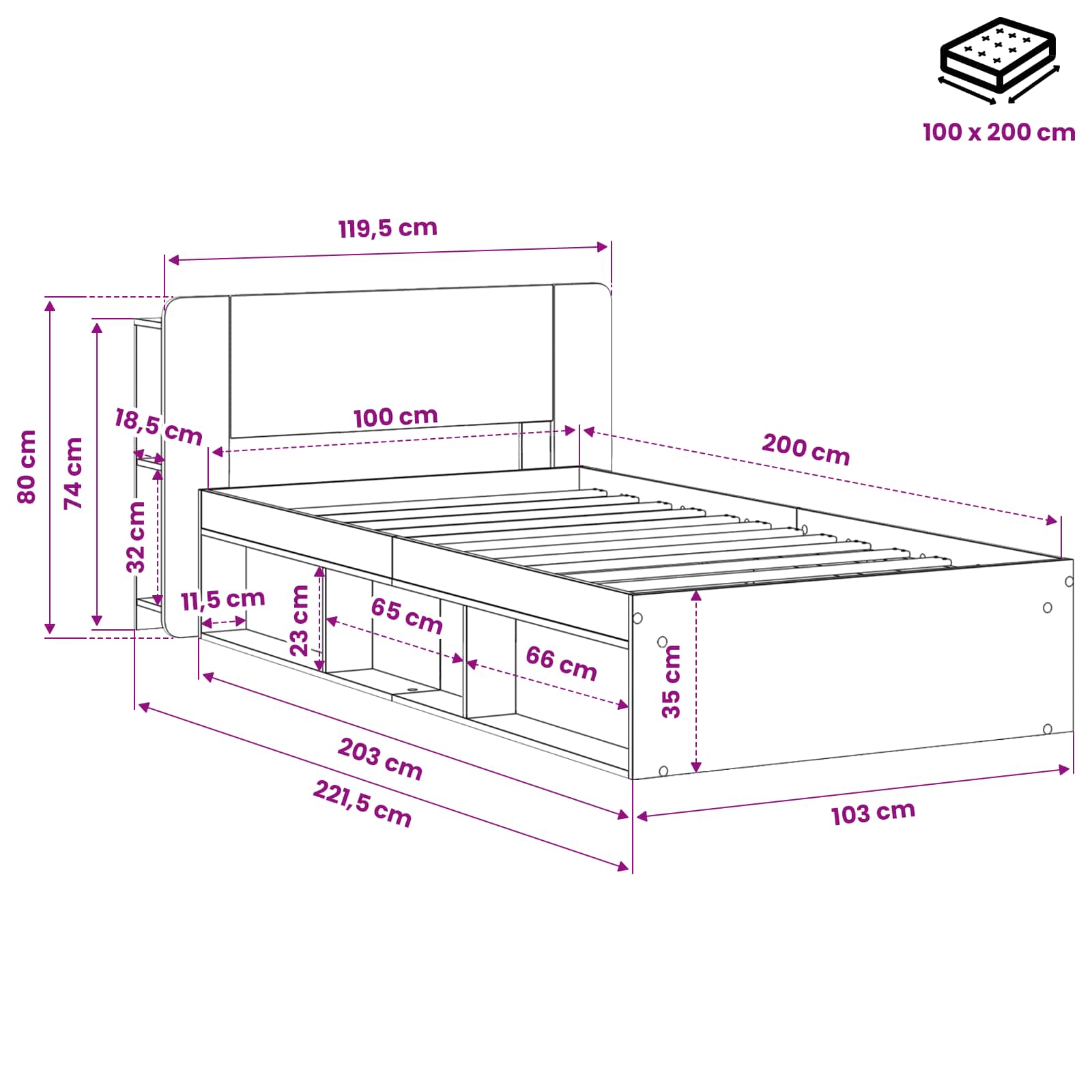 • 1 x Sängyn runko: 103 x 203 x 35 cm (P x L x K)