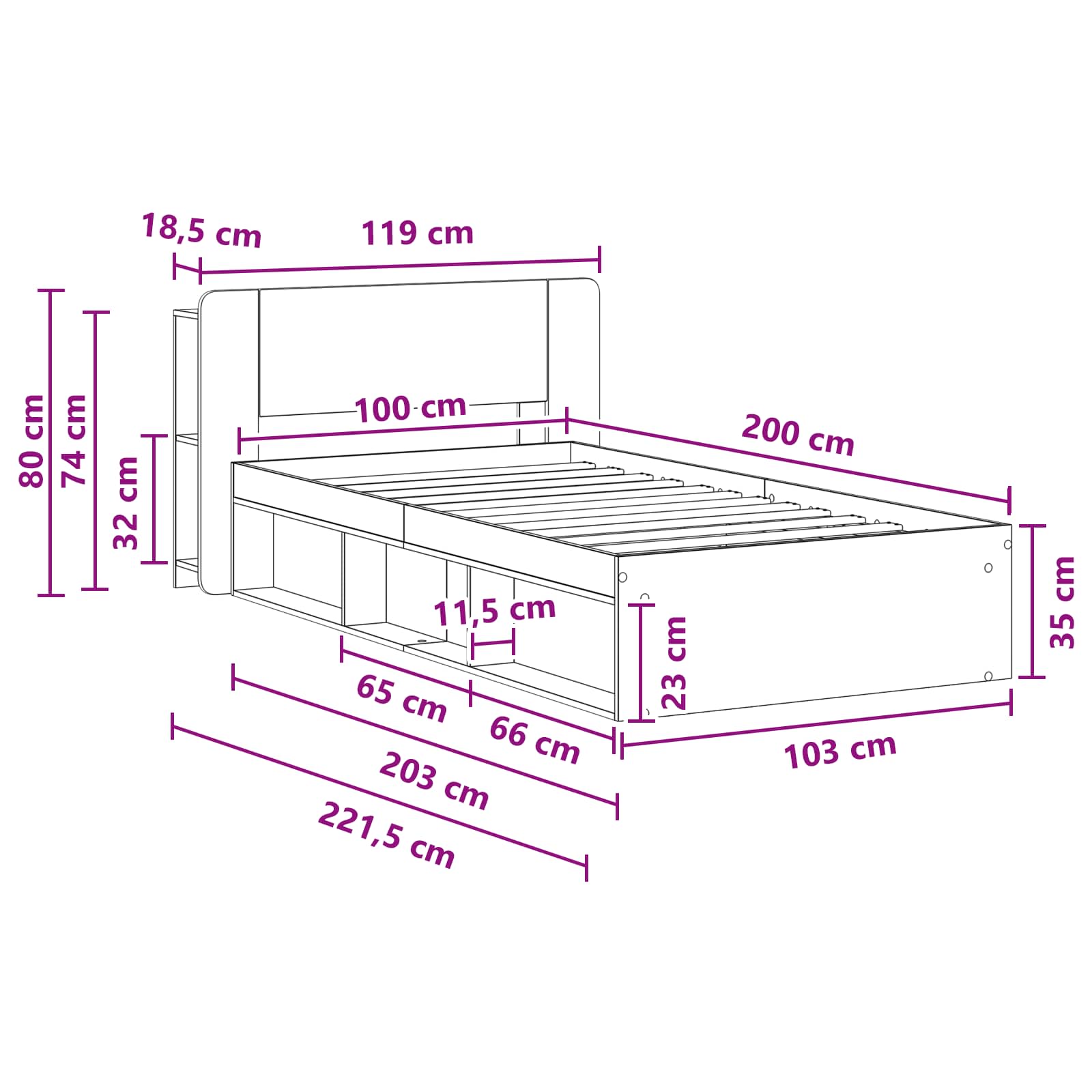 • 1 x Sänky: 103 x 203 x 35 cm (P x L x K)
