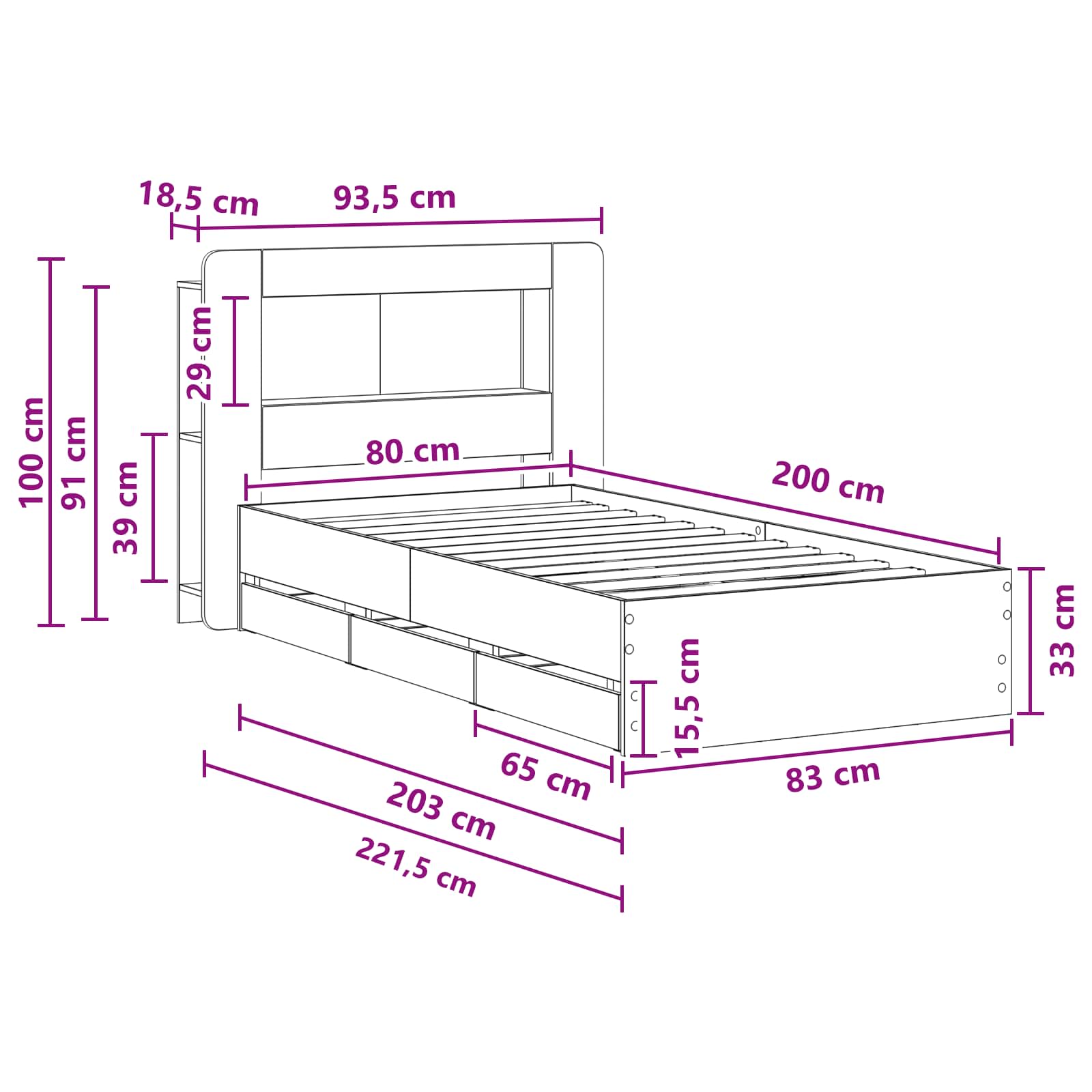 • 1 x Sängyn runko: 83 x 203 x 33 cm (P x L x K)