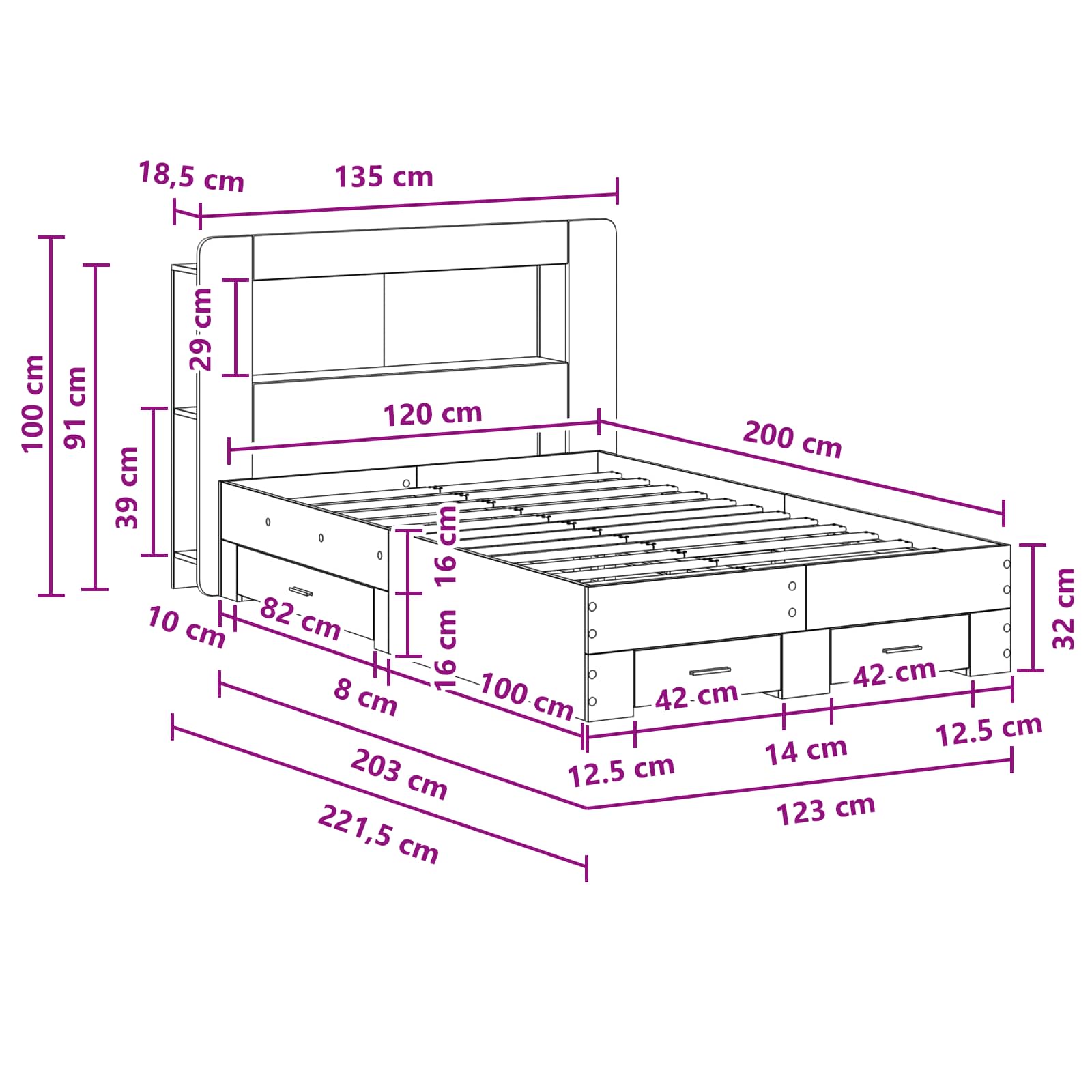 • Runsaasti näyttö- ja säilytystilaa: Sängyn rungon vetolaatikot tarjoavat kätevää säilytystilaa vuodevaatteille tai muille tarvikkeille. Pystysuorat kerrokset pitävät kirjoja tai pieniä esineitä, kun taas etukerros soveltuu suuremmille esineille tai koristeille.