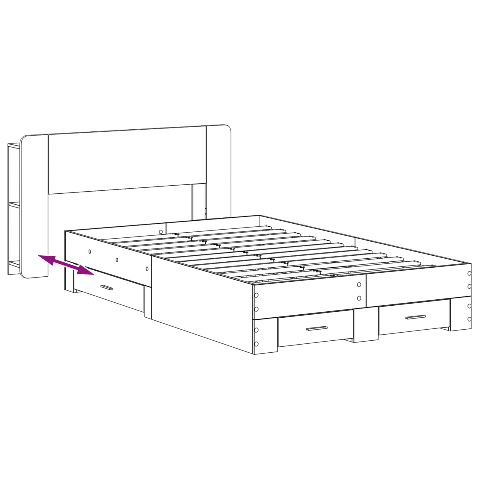 • Runsaasti näyttö- ja säilytystilaa: Sängyn rungon vetolaatikot tarjoavat kätevää säilytystilaa vuodevaatteille tai muille tarvikkeille. Pystysuorat kerrokset pitävät kirjoja tai pieniä esineitä, kun taas etukerros soveltuu suuremmille esineille tai koristeille.