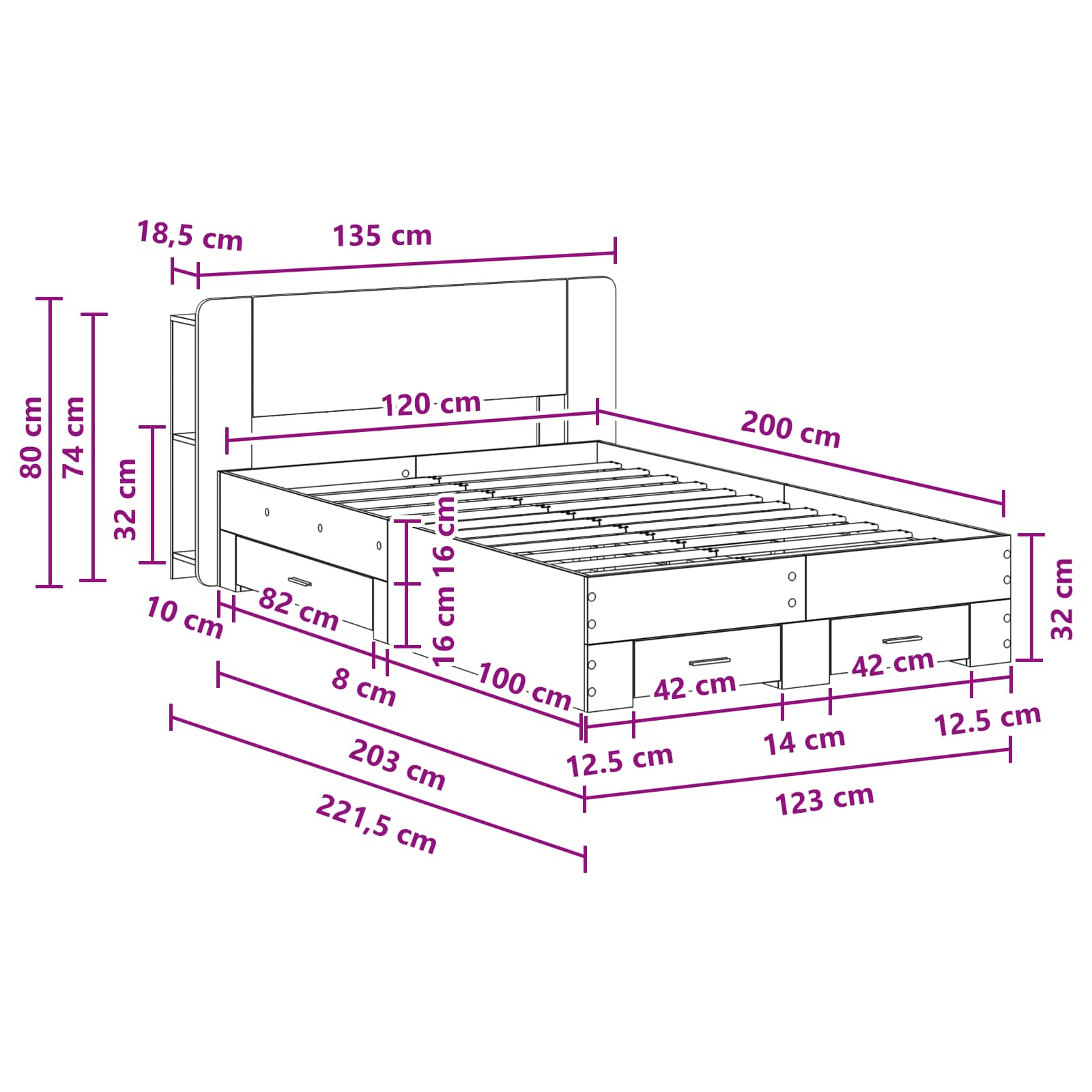 • Yleiset mitat: 135 x 221,5 x 80 cm (P x L x K)
