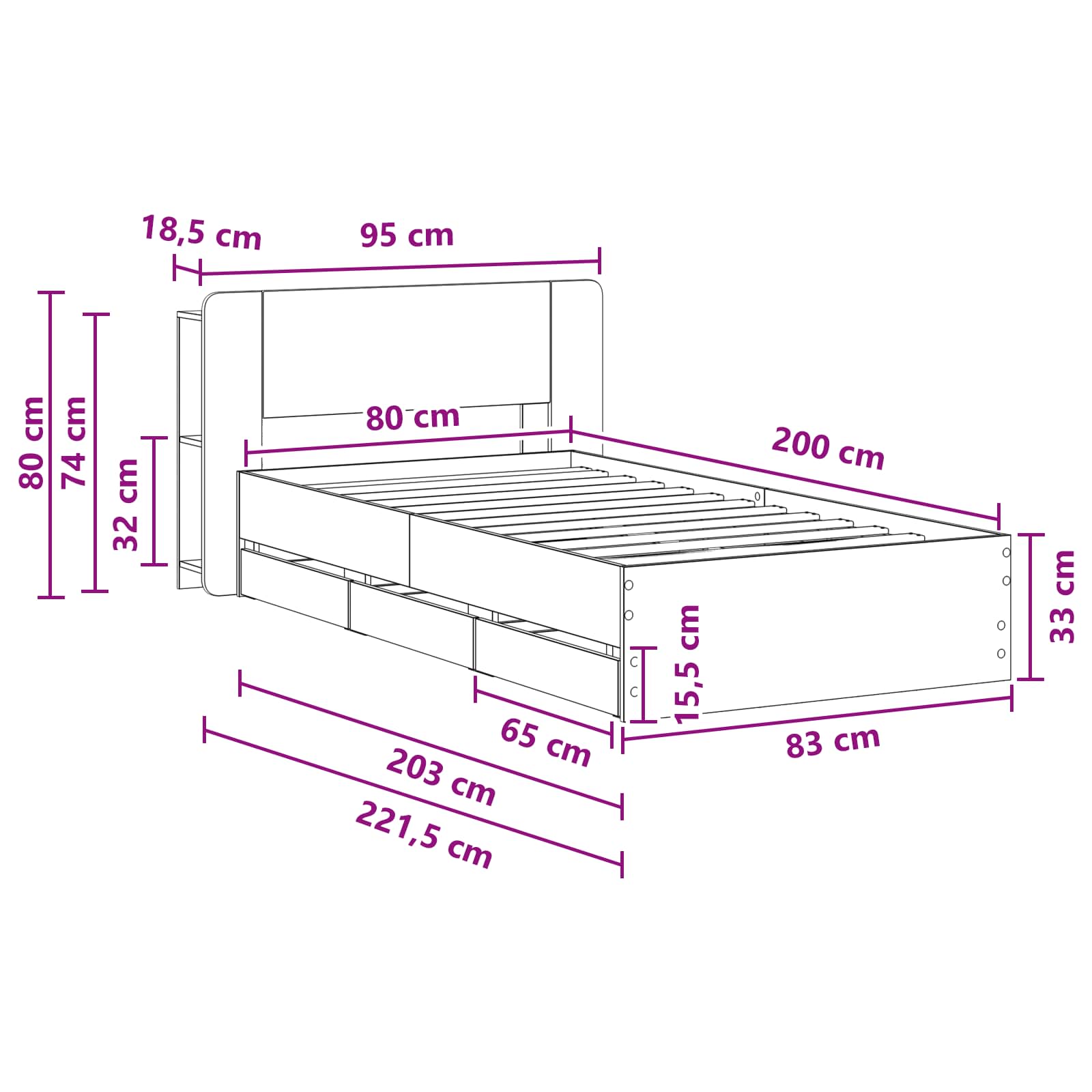 • 1 x Sängyn runko: 83 x 203 x 33 cm (P x L x K)