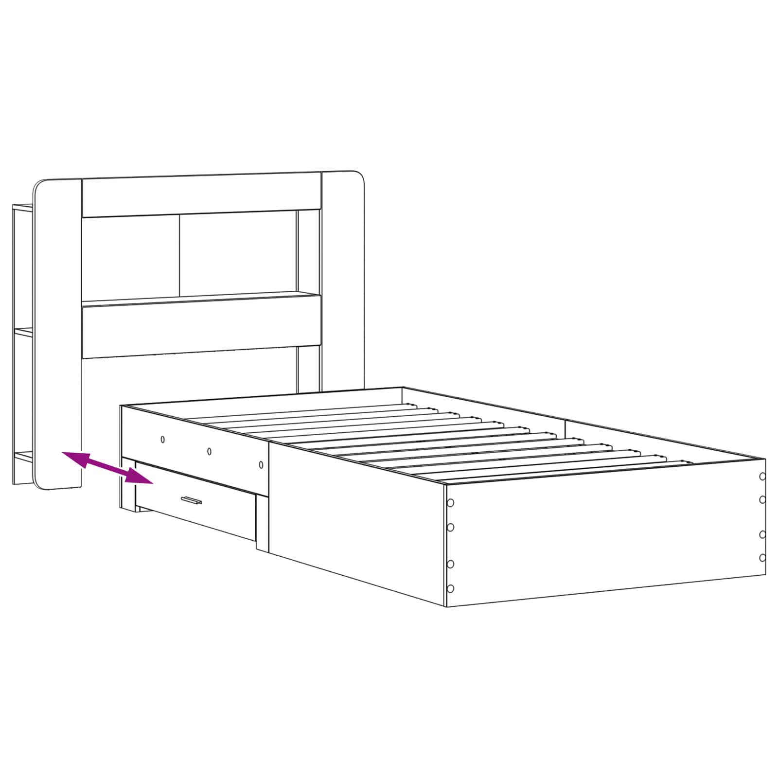 • Runsaasti näyttö- ja säilytystilaa: Sängyn rungon vetolaatikot tarjoavat kätevää säilytystilaa vuodevaatteille tai muille tarvikkeille. Pystysuorat kerrokset pitävät kirjoja tai pieniä esineitä, kun taas etukerros soveltuu suuremmille esineille tai koristeille.
