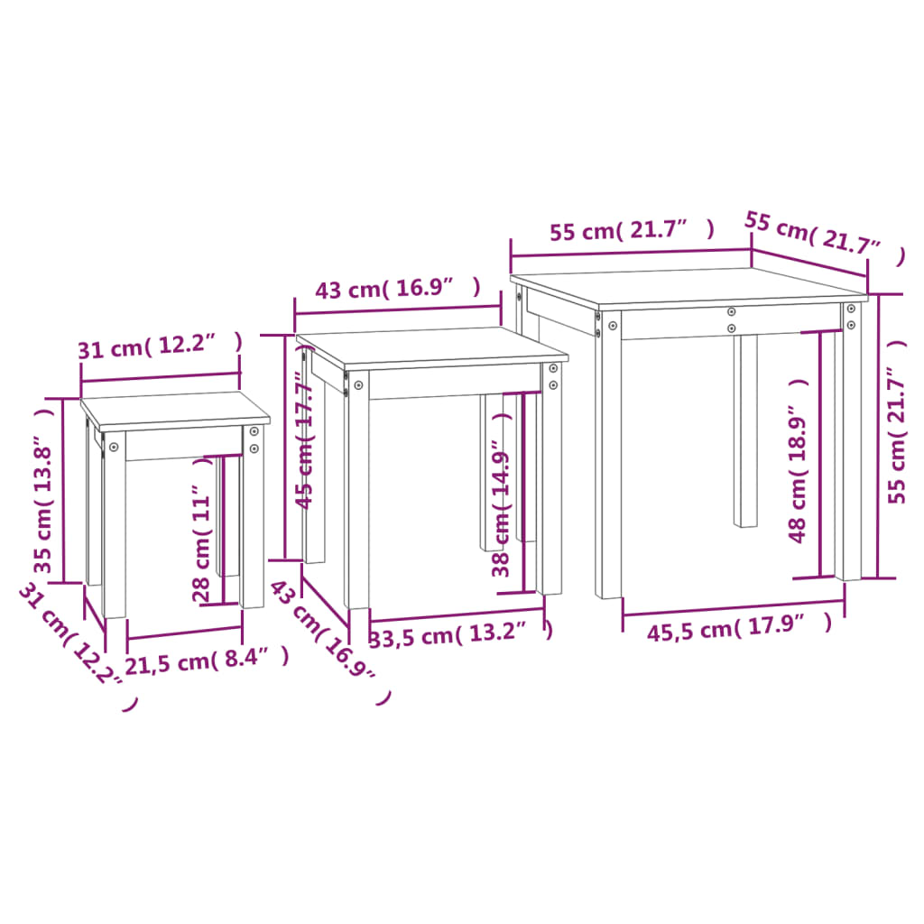 Sarjapöydät 3 kpl valkoinen täysi mänty
