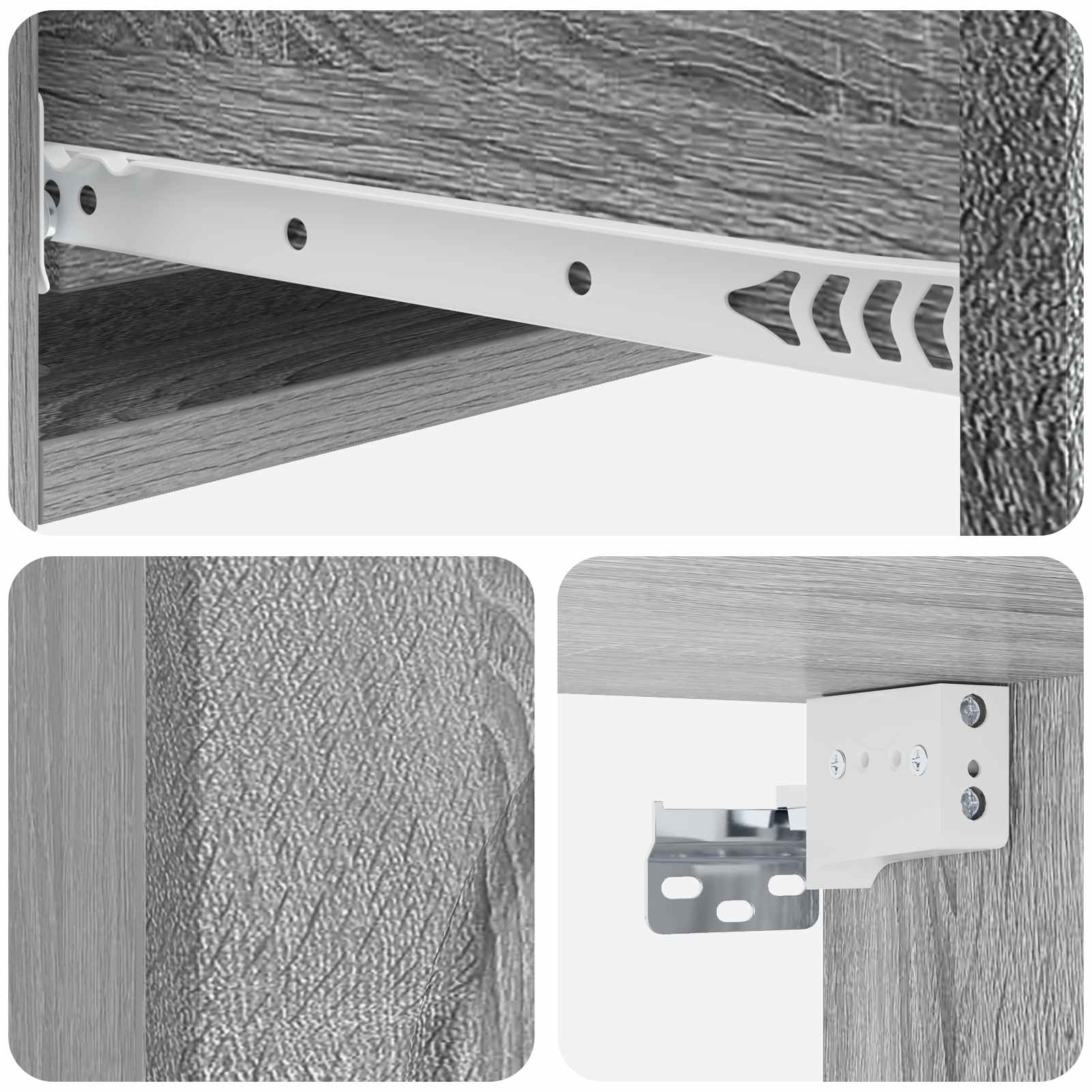 • Materiaalit: Tämä seinälle kiinnitettävä sivupöytä on tehty teknisestä puusta, joka on kestävä ja näyttää hyvältä, varmistaen pitkän käyttöajan. Tää rakenne tuo modernia ilmettä ja tukee tavaroita hyvin.
