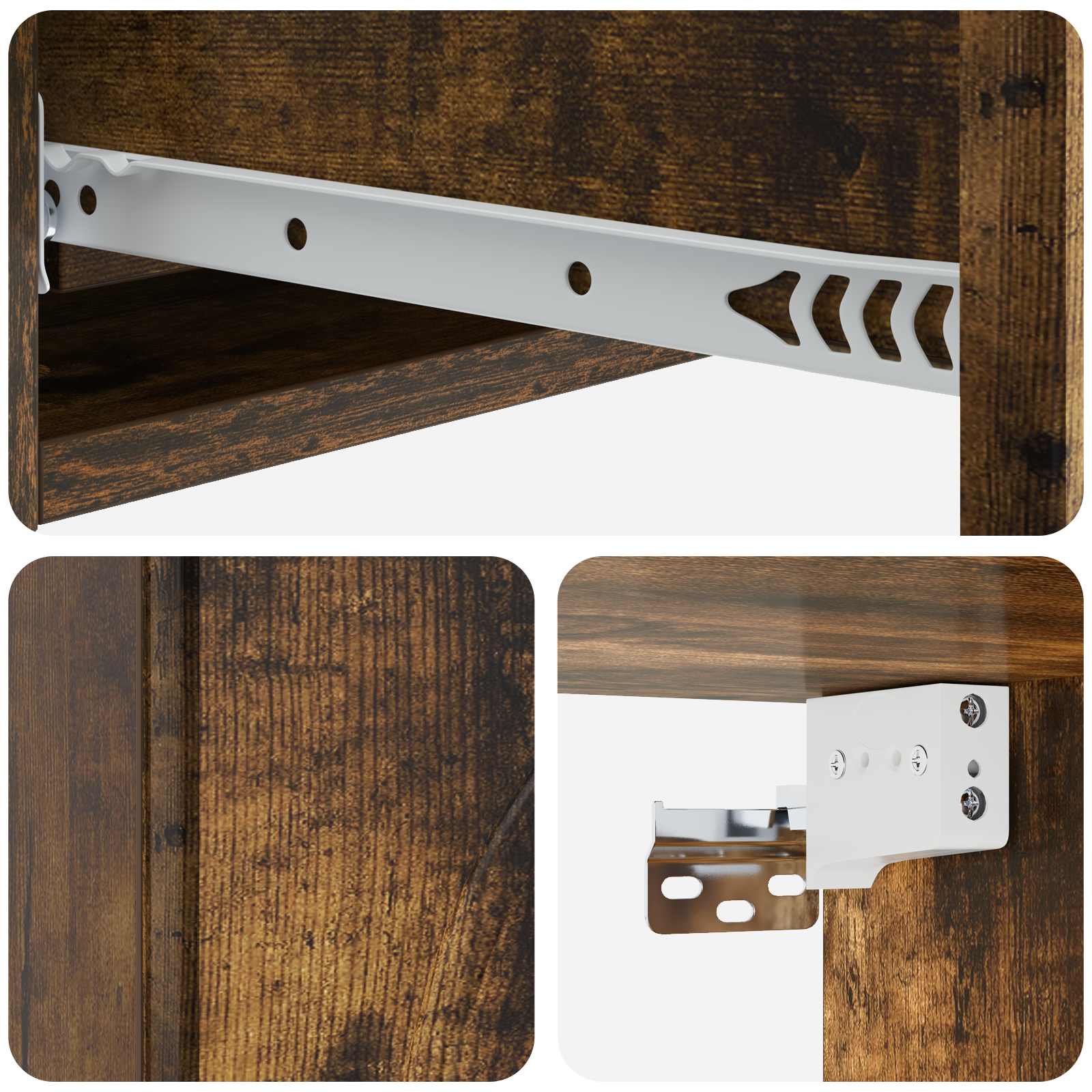 • Materiaalit: Tämä seinälle kiinnitettävä sivupöytä on tehty teknisestä puusta, joka on kestävä ja näyttää hyvältä, varmistaen pitkän käyttöajan. Tää rakenne tuo modernia ilmettä ja tukee tavaroita hyvin.