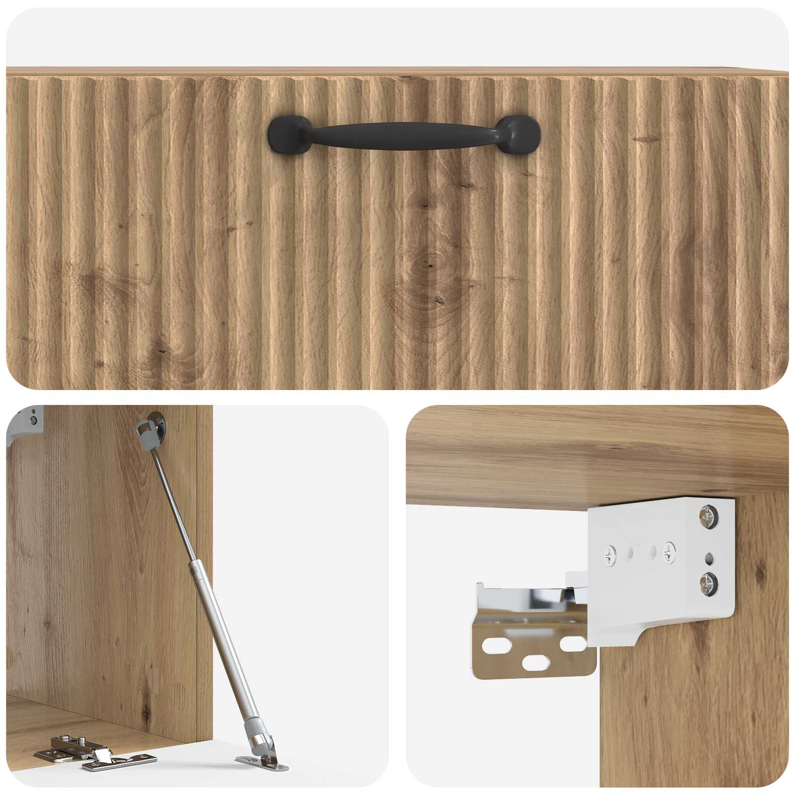 • Tyylikkäät mustat tankokahvat: Jokaisessa ovessa on pitkät mustat tankokahvat, jotka tuovat modernia eleganssia. Nämä kahvat parantavat kaapin ulkonäköä ja tekevät siitä helppokäyttöisen.