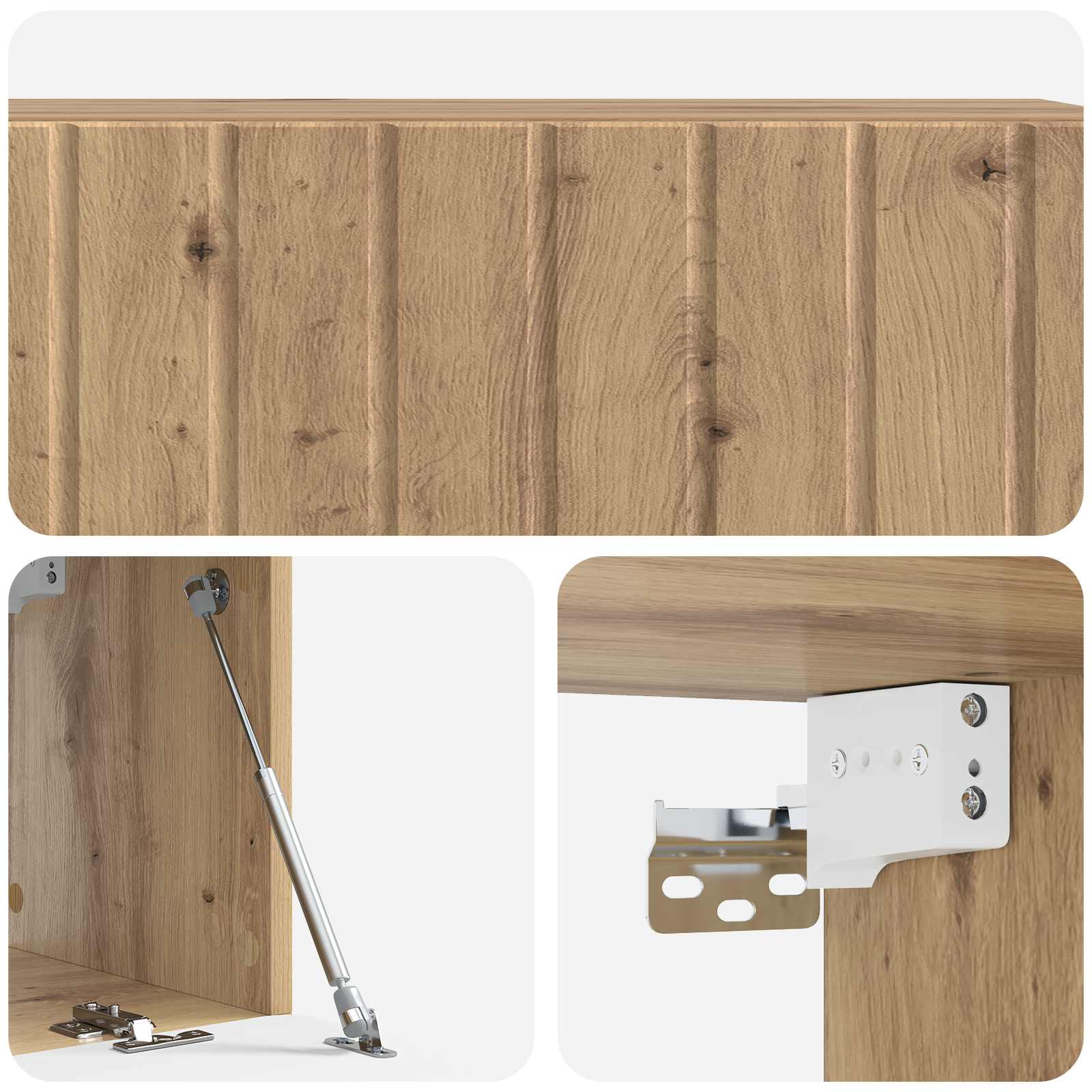• Valmistettu teknisestä puusta: Tää kaappi näyttää upealta kestävästä teknisestä puusta, joka kestää arjen kulutusta. Sen vankka rakenne tarjoaa puhtaan ja kiiltävän ilmeen, joka sopii monenlaisiin moderneihin sisustuksiin.