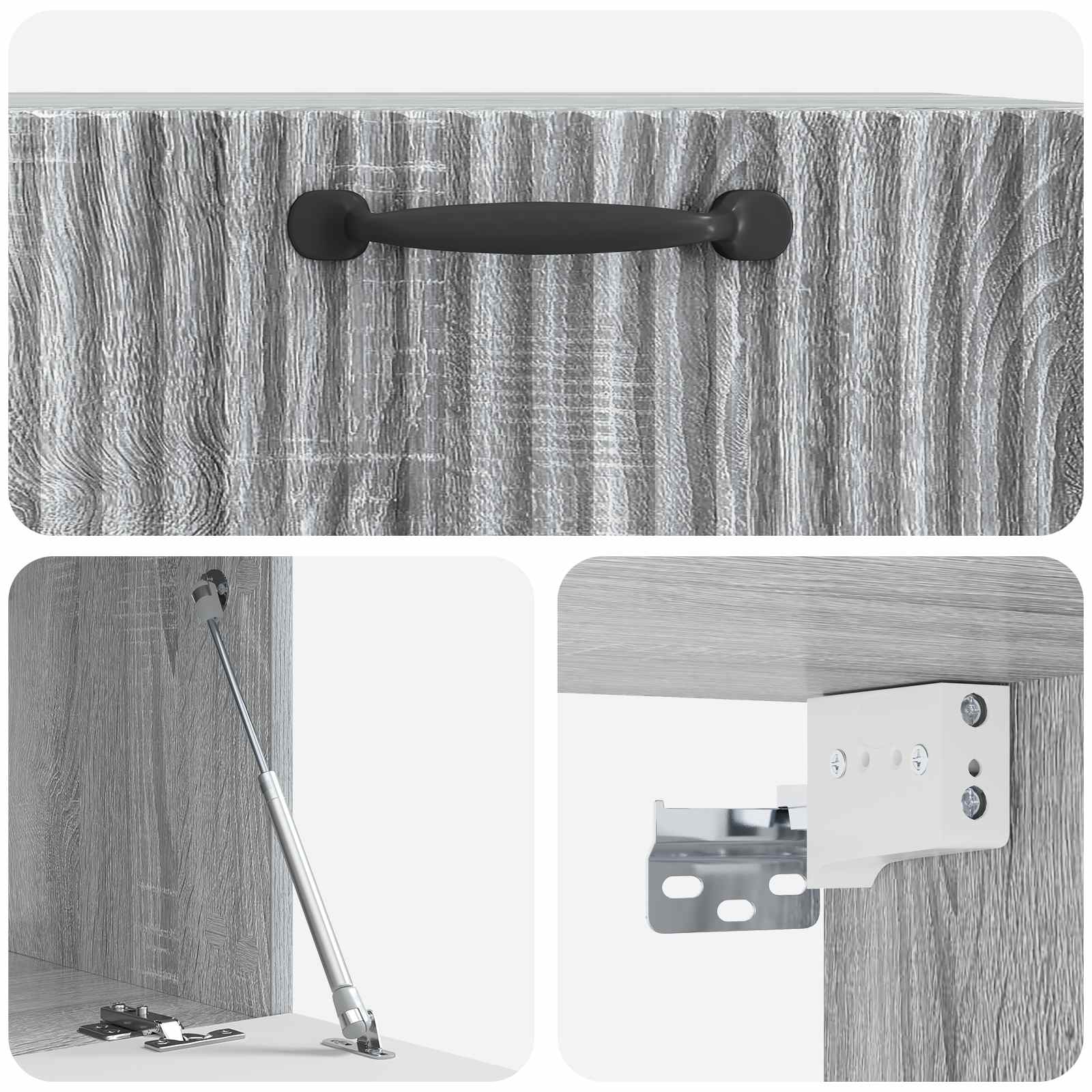 • Tyylikkäät mustat tankokahvat: Jokaisessa ovessa on pitkät mustat tankokahvat, jotka tuovat modernia eleganssia. Nämä kahvat parantavat kaapin ulkonäköä ja tekevät siitä helppokäyttöisen.