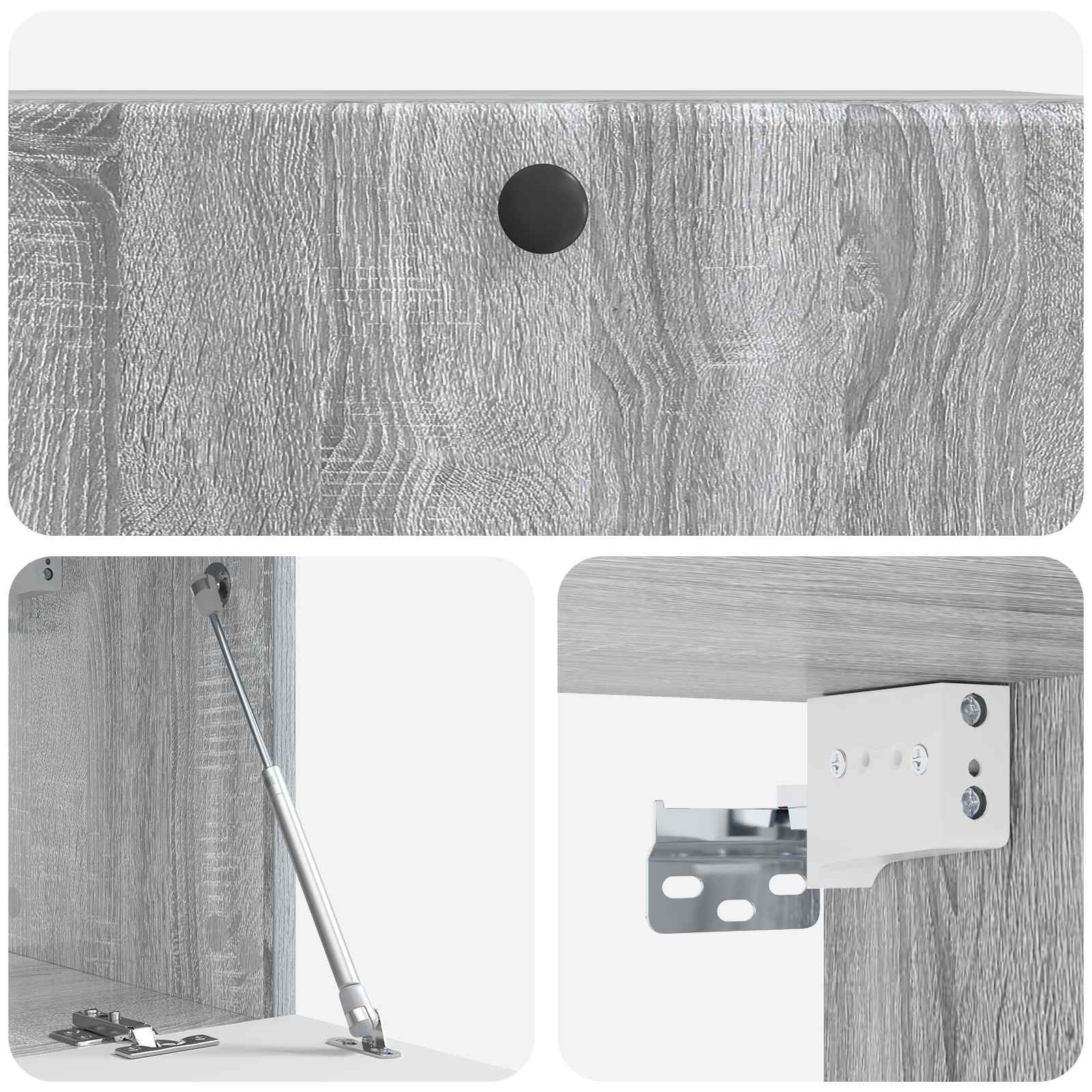 • Toimitettavat osat: 90° kääntyvät saranat ja käytännölliset metallinupit tekevät pääsystä säilytystiloihin vaivatonta. Kaikki osat on suunniteltu niin, että säilytys on helppoa ja siistiä, mikä auttaa luomaan järjestelyyn mukautuvan ulkonäön. Seinäasennus antaa lisää lattiatilaa ja sulautuu kauniisti oleskelualueisiin.