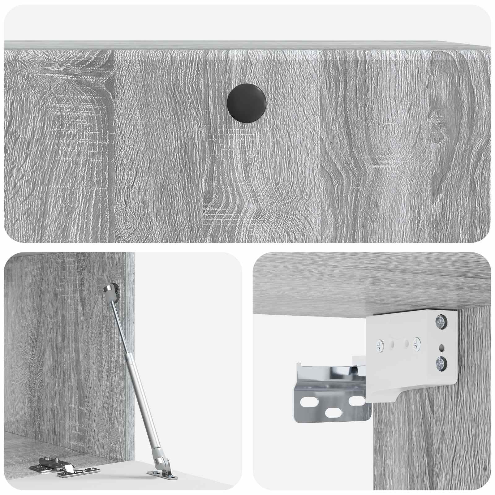 • Toimitettavat osat: 90° kääntyvät saranat ja käytännölliset metallinupit tekevät pääsystä säilytystiloihin vaivatonta. Kaikki osat on suunniteltu niin, että säilytys on helppoa ja siistiä, mikä auttaa luomaan järjestelyyn mukautuvan ulkonäön. Seinäasennus antaa lisää lattiatilaa ja sulautuu kauniisti oleskelualueisiin.