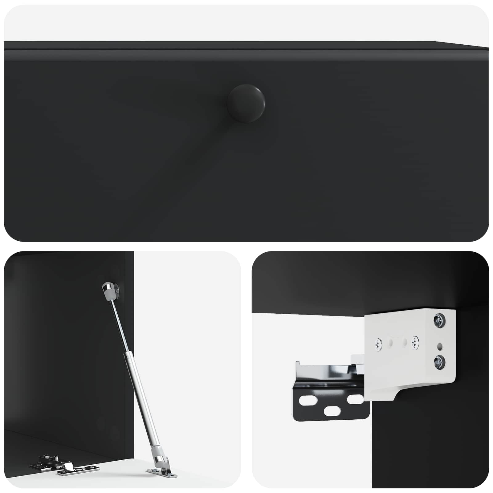 • Toimitettavat osat: 90° kääntyvät saranat ja käytännölliset metallinupit tekevät pääsystä säilytystiloihin vaivatonta. Kaikki osat on suunniteltu niin, että säilytys on helppoa ja siistiä, mikä auttaa luomaan järjestelyyn mukautuvan ulkonäön. Seinäasennus antaa lisää lattiatilaa ja sulautuu kauniisti oleskelualueisiin.