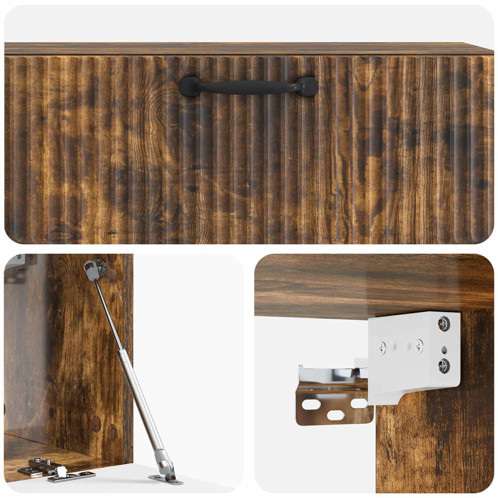 • Toiminnalliset 90° kiertosaranat: Kaapissa on kätevät 90° kiertosaranat, jotka helpottavat pääsyä säilytettävään tavaraan. Nämä ovet on rakennettu käytettäväksi helposti, säilyttäen tyylikkään ilmeen.
