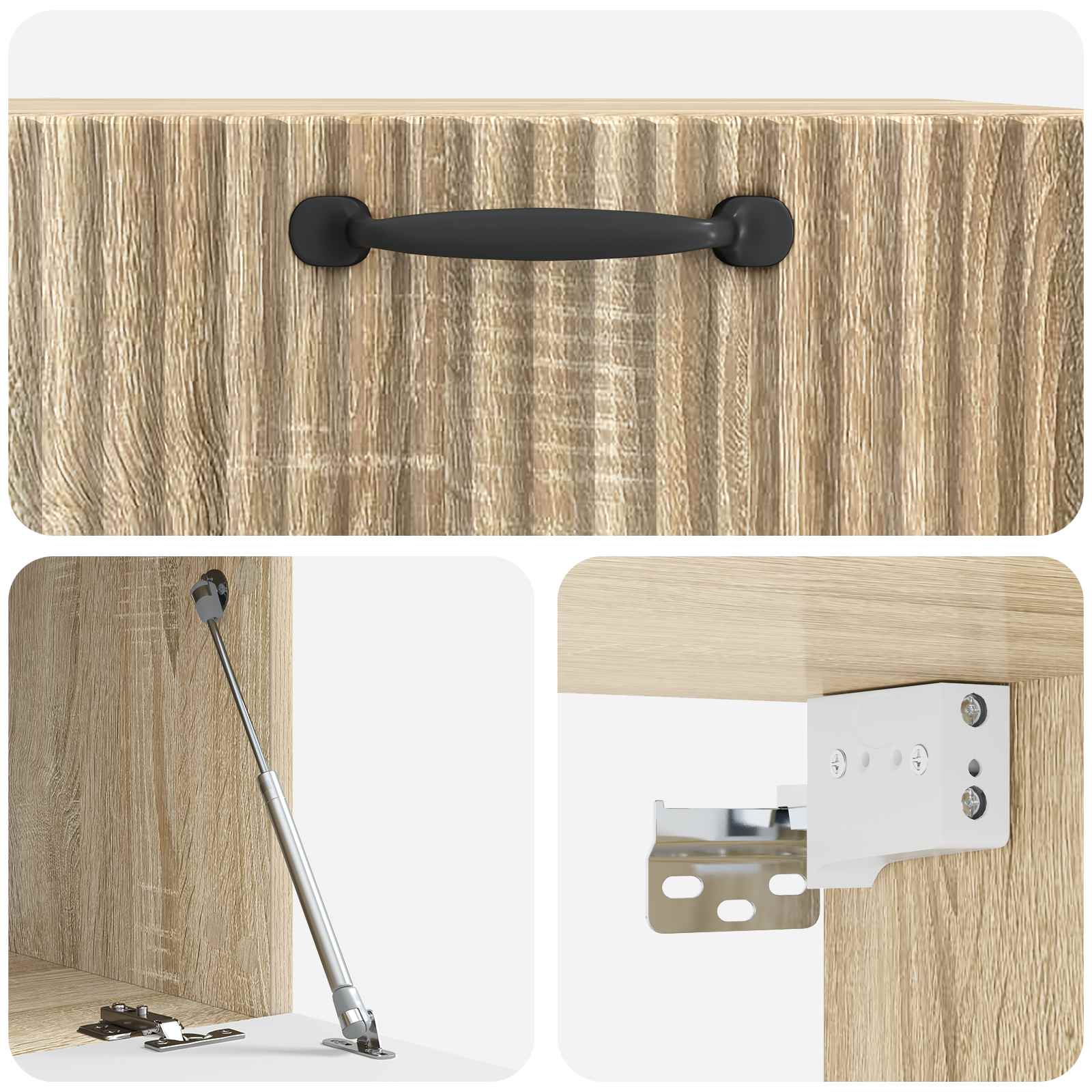 • Tyylikkäät mustat tankokahvat: Jokaisessa ovessa on pitkät mustat tankokahvat, jotka tuovat modernia eleganssia. Nämä kahvat parantavat kaapin ulkonäköä ja tekevät siitä helppokäyttöisen.