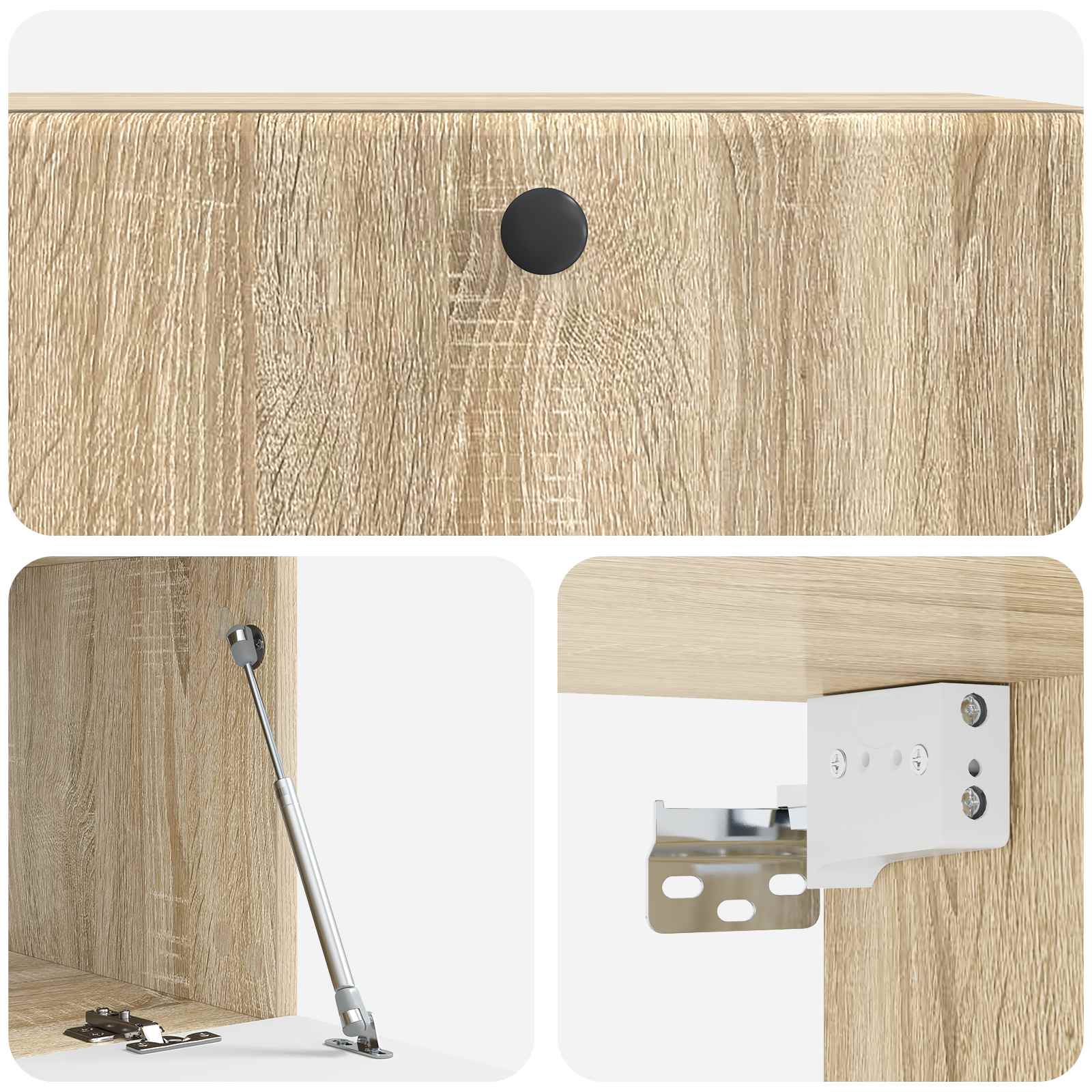 • Toimitettavat osat: 90° kääntyvät saranat ja käytännölliset metallinupit tekevät pääsystä säilytystiloihin vaivatonta. Kaikki osat on suunniteltu niin, että säilytys on helppoa ja siistiä, mikä auttaa luomaan järjestelyyn mukautuvan ulkonäön. Seinäasennus antaa lisää lattiatilaa ja sulautuu kauniisti oleskelualueisiin.