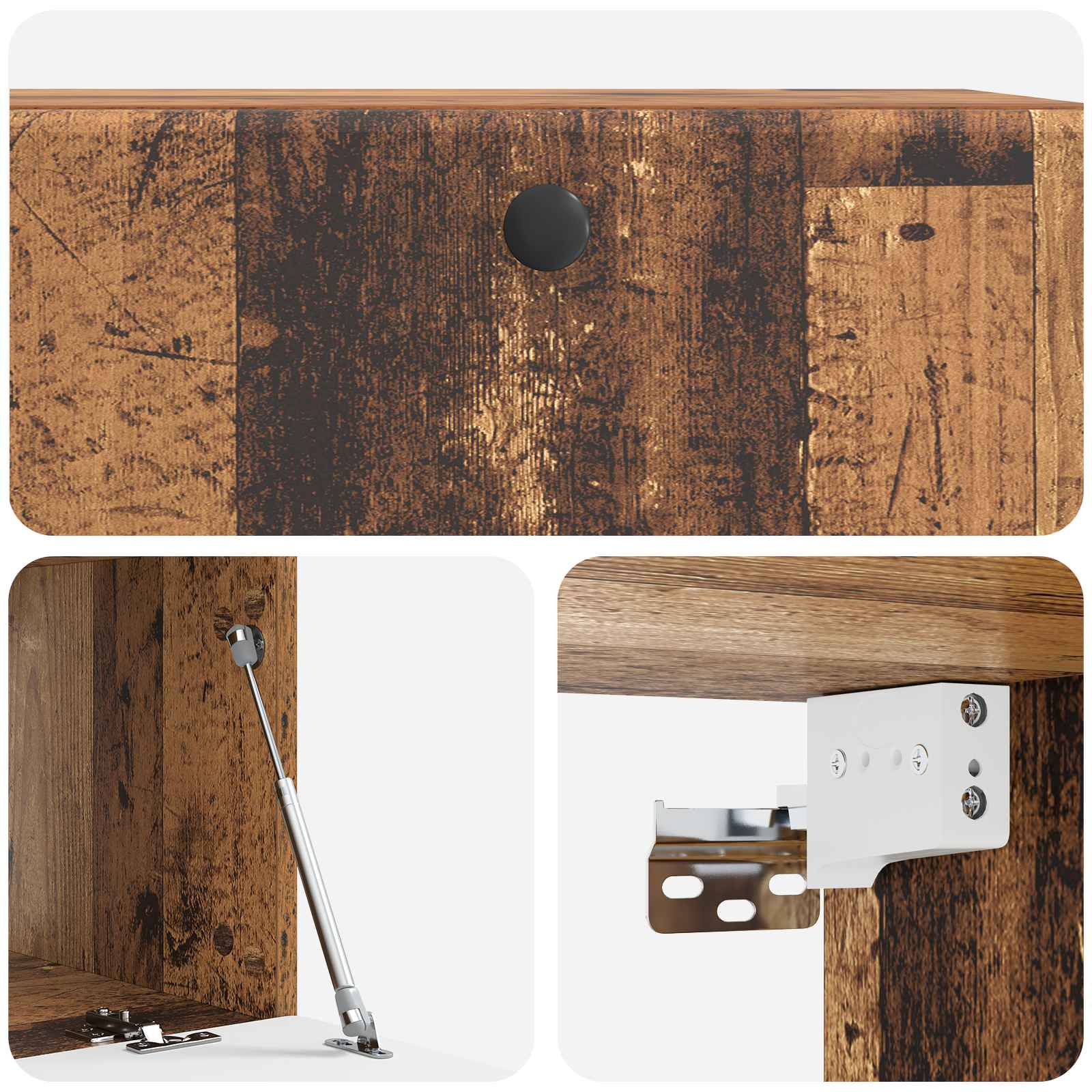 • Toimitettavat osat: 90° kääntyvät saranat ja käytännölliset metallinupit tekevät pääsystä säilytystiloihin vaivatonta. Kaikki osat on suunniteltu niin, että säilytys on helppoa ja siistiä, mikä auttaa luomaan järjestelyyn mukautuvan ulkonäön. Seinäasennus antaa lisää lattiatilaa ja sulautuu kauniisti oleskelualueisiin.