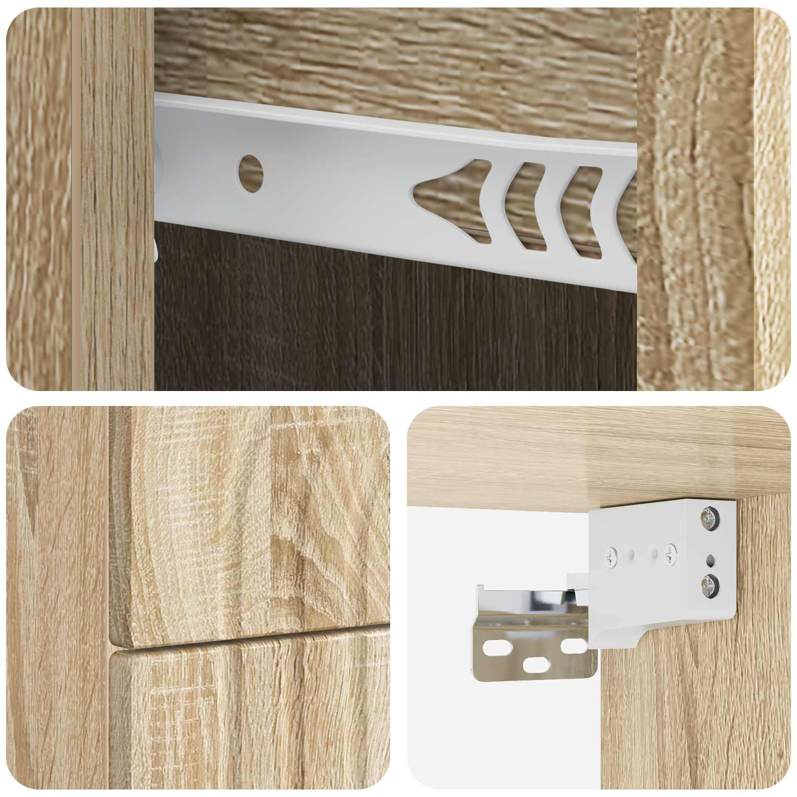 • Tekninen puu Tämä kaappi on valmistettu laadukkaasta teknisestä puusta, mikä takaa kestävän ja sileän pinnan, joka tuo esiin vintage-tyylin. Materiaali kestää hyvin käyttöä, joten se on luotettava lisä huonekalukokoelmaasi.