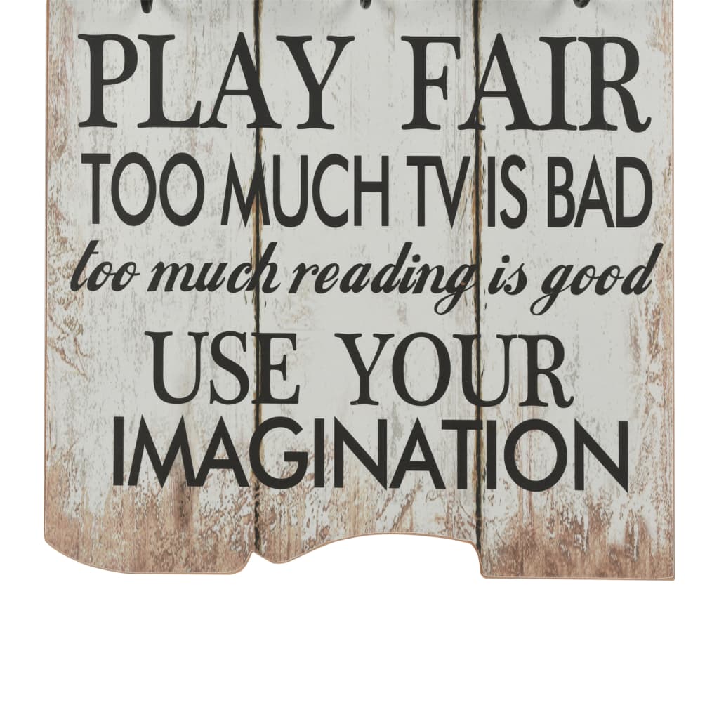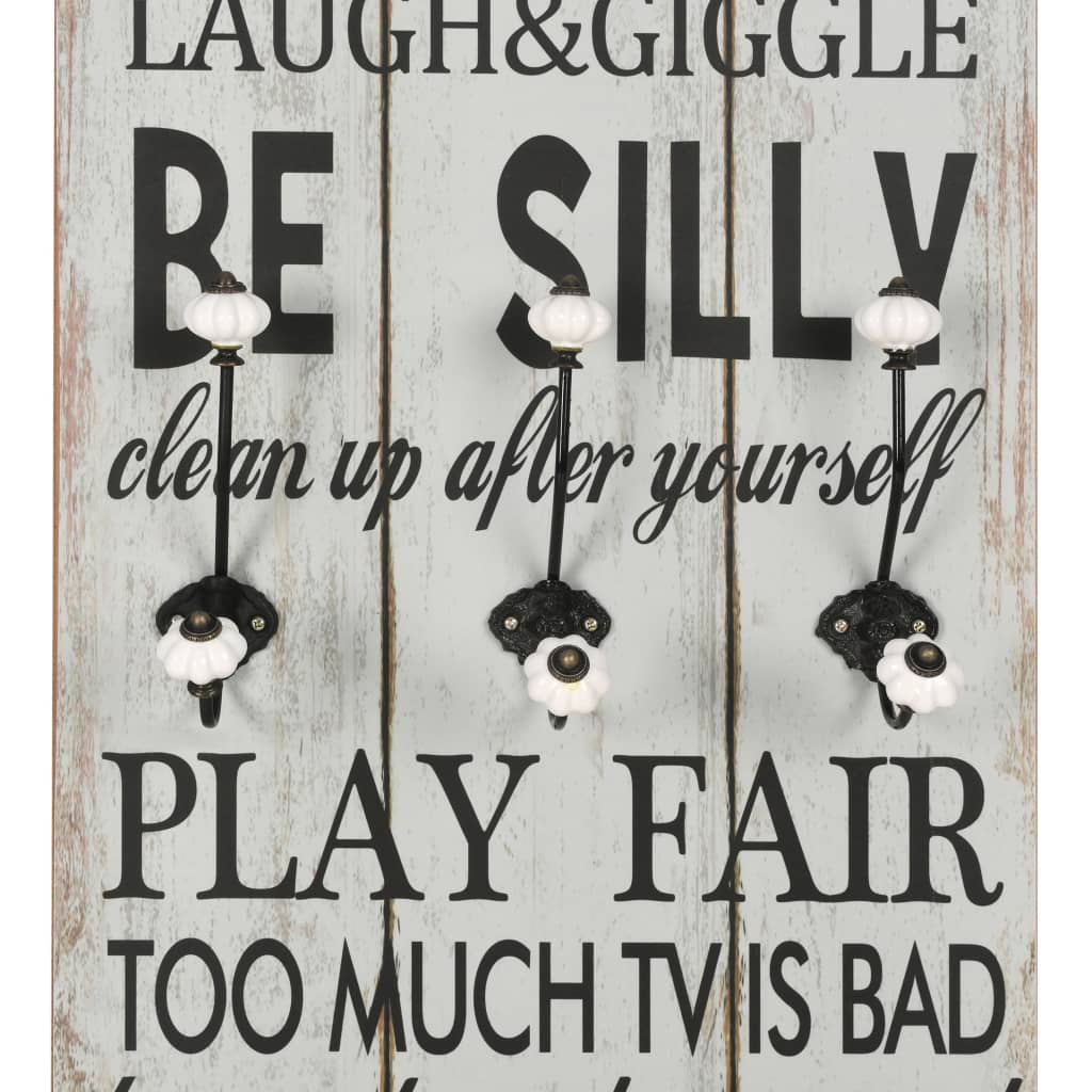 Seinänaulakossa on vintagetyylinen painatus ’Play room rules Ignore mean ones Thank you Be silly Play fair Use your imagination’ sekä 6 koukkua, siitä tulee oikea katseenvangitsija, jonka vieraasi huomaavat varmasti heti saapuessaan kylään.