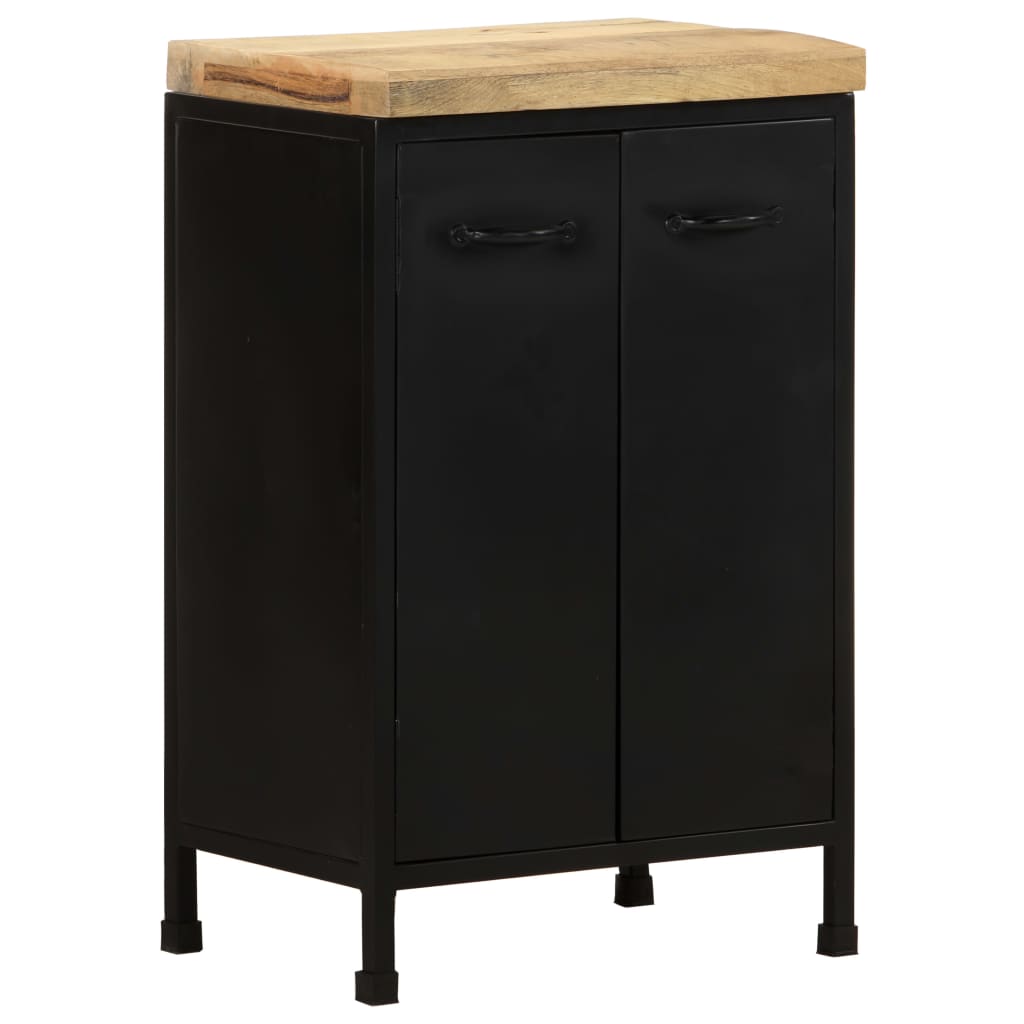 Sivukaappi on valmistettu karkeasta mangopuusta, trooppisesta lehtipuusta, jolla on voimaa kantaa painoa. Se kestää myös ajan patinaa, tehden siitä vakaan ja kestävän. Jauhemaalattu rautarunko tuo siihen lisävakautta. Kaapissa on kaksi ovea ja se tarjoaa runsaasti säilytystilaa. Vankka pöytälevy on ihanteellinen paikka laittaa esille koriste-esineitä, kuten valokuvakehyksiä, ruukkukasveja, kukkamaljakoita, jne.