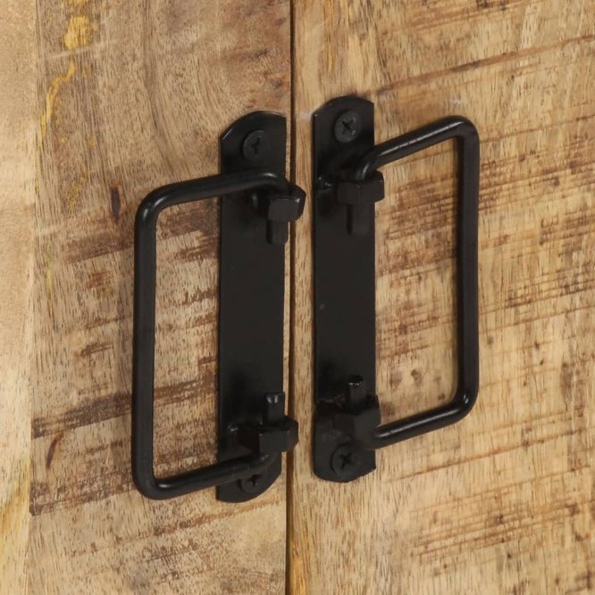 Tämä kaappi on valmistettu kiinteästä mangopuusta, joka on tiheäsyinen kovapuu. Kova mangopuu kestää niin painoa kuin ajan kulumaa. Sen vuoksi tämä huomiota herättävän kaunis kaappi on todella vakaa, kestävä ja katseet vangitseva. Taitava käsityö takaa, että jokainen valmistusvaihe on suoritettu erityisellä huolella, oli kyseessä sitten kiillotus, maalaus tai lakkaus. Jauhemaalattu teräsrunko lisää sivukaapin teollista tyyliä ja vakautta. Sivupöydässä on 2 kaappia 3:lla ovella ja 1 osasto, eli runsaasti tilaa multimedialaitteille, kirjoille ja muille esineille.