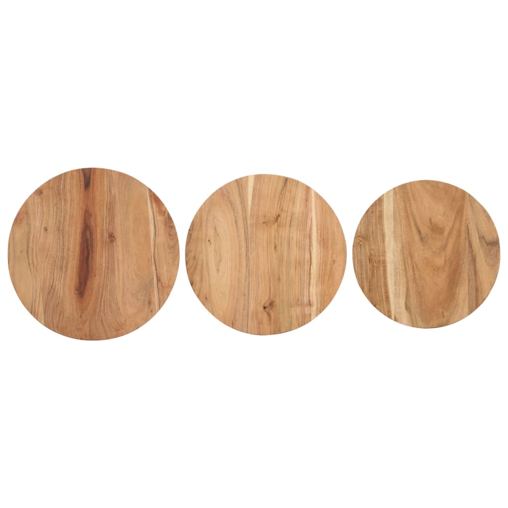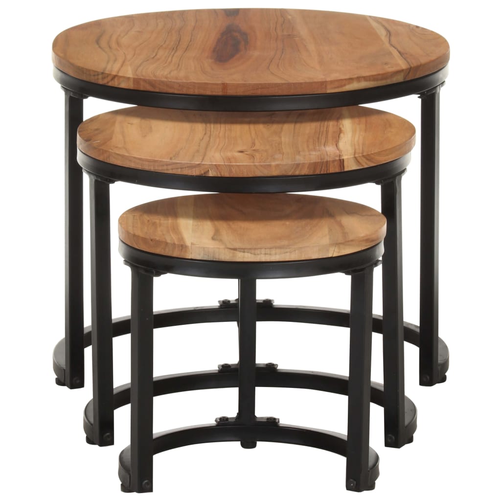 Tämä pöytäsarja on valmistettu täydestä akaasiapuusta, joka tekee pöydistä vakaita. Erinomainen käsityötaito ja kauniit puukuviot tekevät jokaisesta kappaleesta hieman erilaisen kuin muista. Kiinteä pöytälevy tarjoaa vakaan ja turvallisen pinnan, jolle voit asettaa erilaisia esineitä. Jauhemaalattu rautainen jalusta antaa lisänsä pöydän tukevuudelle ja vakaudelle. Voit halutessasi asettaa pöydät porrastetusti tai erikseen omien tarpeidesi mukaan. Tilansäästämiseksi ne voidaan pinota päällekkäin, kun ne eivät ole käytössä.