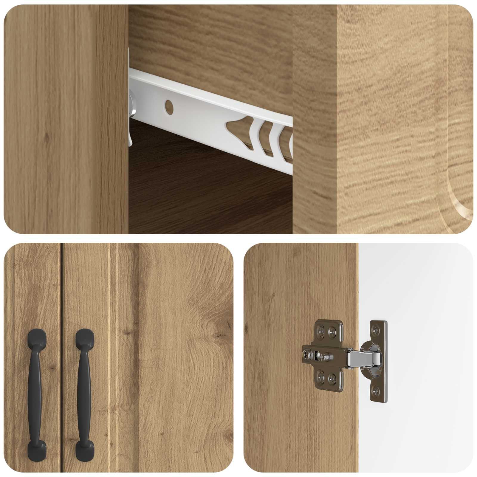 • Included Components: Sivupöydässä on useita levyhyllyjä, jotka tarjoavat paljon tilaa tavaroillesi. Metalliset vetimet tekevät avaamisesta ja sulkemisesta helppoa, ja 90° keinusaranaovet tarjoavat vaivattoman pääsyn säilytettävään. Jokainen osa on suunniteltu parantamaan käyttökokemusta yhdistäen käytettävyyden ja tyylin.