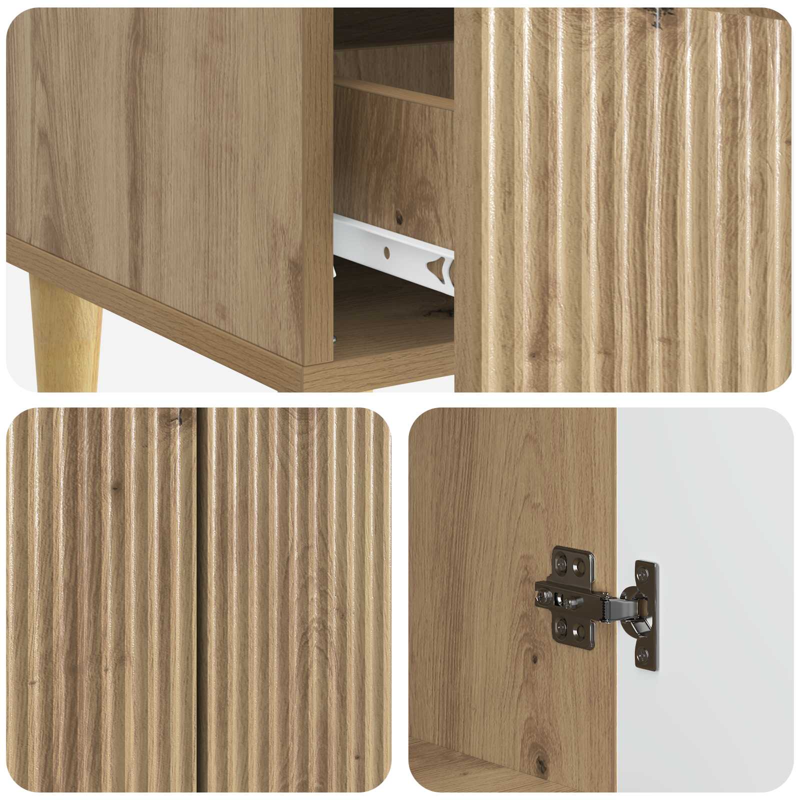 • Sisältää osat: Tämä buffetti on varustettu useilla säilytystiloilla ja liukuovilla, mikä helpottaa pääsyä ja pitää ympäristön siistinä. Komparmentit tarjoavat runsaasti tilaa erilaisten esineiden järjestämiseen, säilyttäen samalla huoneen tyylin.