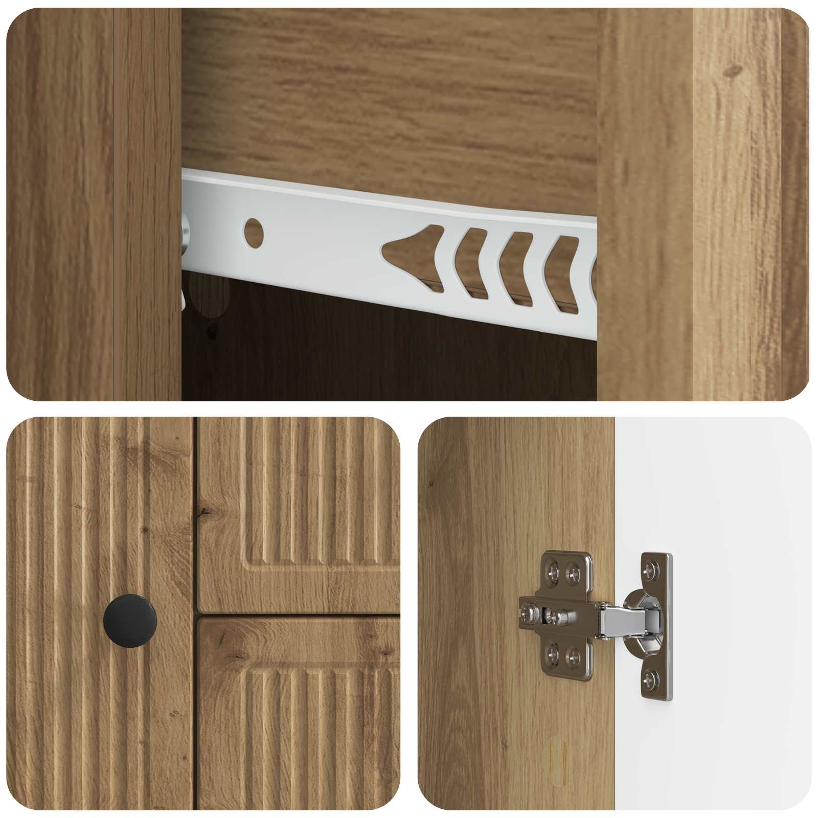 • Yhdessä tulevat osat: Tässä sivupöydässä on kestävät rullalaatikot, käytännölliset levyhyllyt ja tukevat 90° keinutaroimet, jotka on kaikki valmistettu luotettavasta teknisestä puusta. Siitä löytyvät tyylikkäät nuppikahvat, jotka helpottaa pääsyä, parantaen käyttömukavuutta.