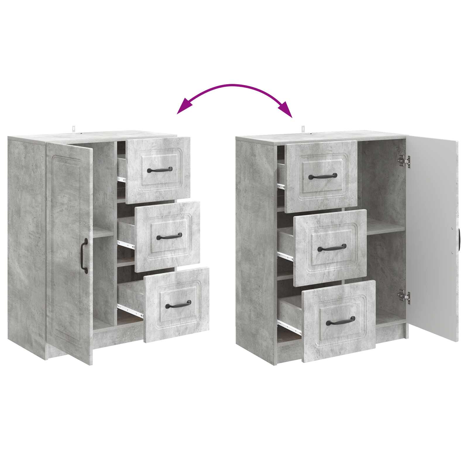 • Kätevät ovet ja laatikot – Sivupöydässä on 90° keinosaranaovet ja laiteluukut, jotka antaa helpon pääsyn säilytettyihin tavaroihin. Nää ominaisuudet tekee järjestyksen ylläpidosta ja tavaroiden käyttöönotosta nopeaa, lisäten käytettävyyttä huoneessa.