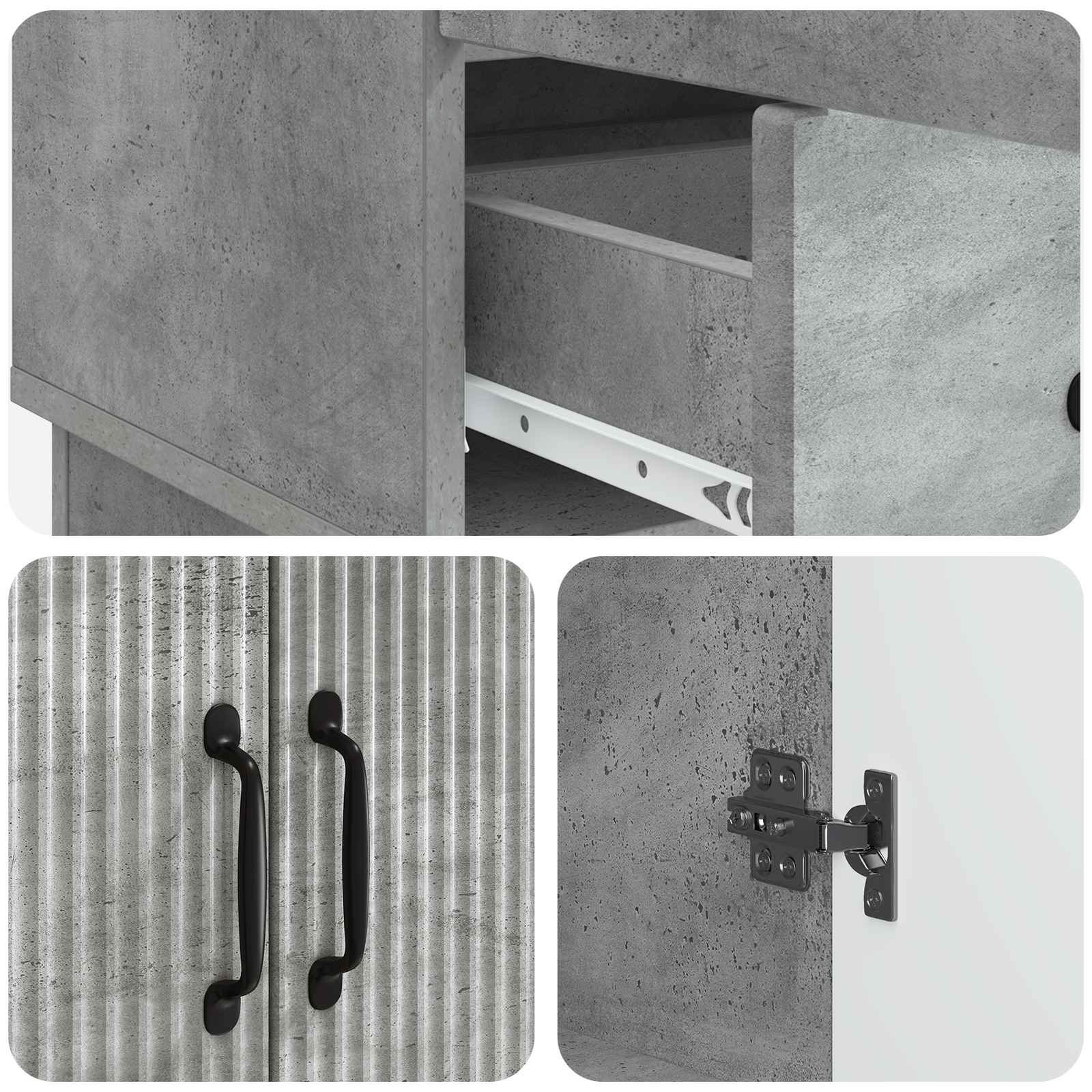 • Säädettävät hyllyt: Mukana on säädettävät hyllyt, jotka antavat joustovaraa tavaroiden järjestämiseen. Tää ominaisuus palvelee erikokoisia esineitä, joten voit mukauttaa tilan haluamallasi tavalla. Olitpa säilyttämässä isoja tarjoilulautasia tai pienempiä välineitä, säädettävät hyllyt tekevät sivupöydän järjestelystä helppoa.