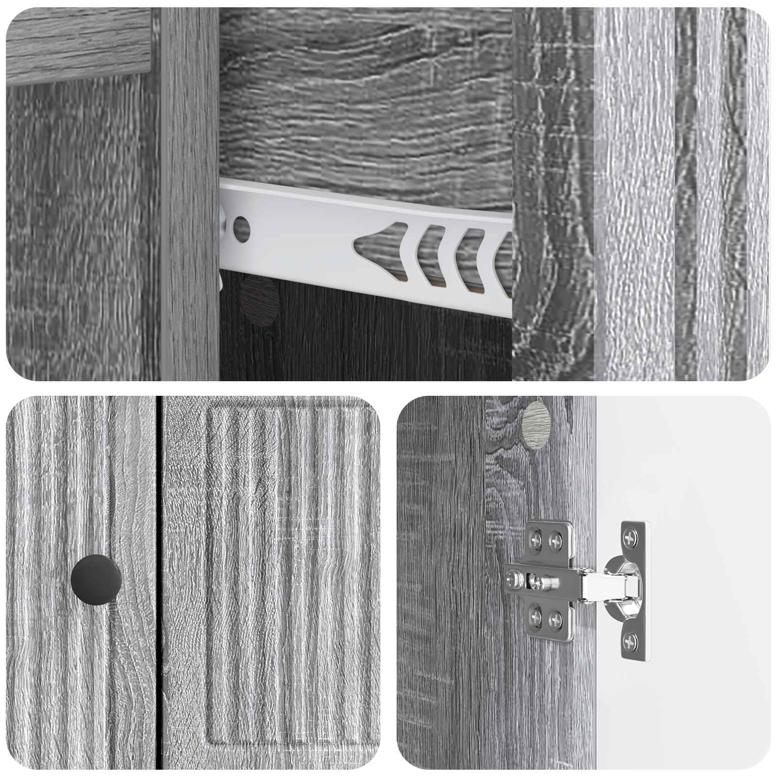 • Metalliset kahvat: Sivupöydän laatikoissa ja ovissa on tyylikkäät metallikahvat, jotka tekevät käytöstä helppoa. Kahvat tuovat ripauksen hienostuneisuutta ja helpottavat säilytettävien esineiden käyttöä. Niiden ajaton muotoilu täydentää vintage-ilmettä ja tarjoaa käytännön kätevyyttä.