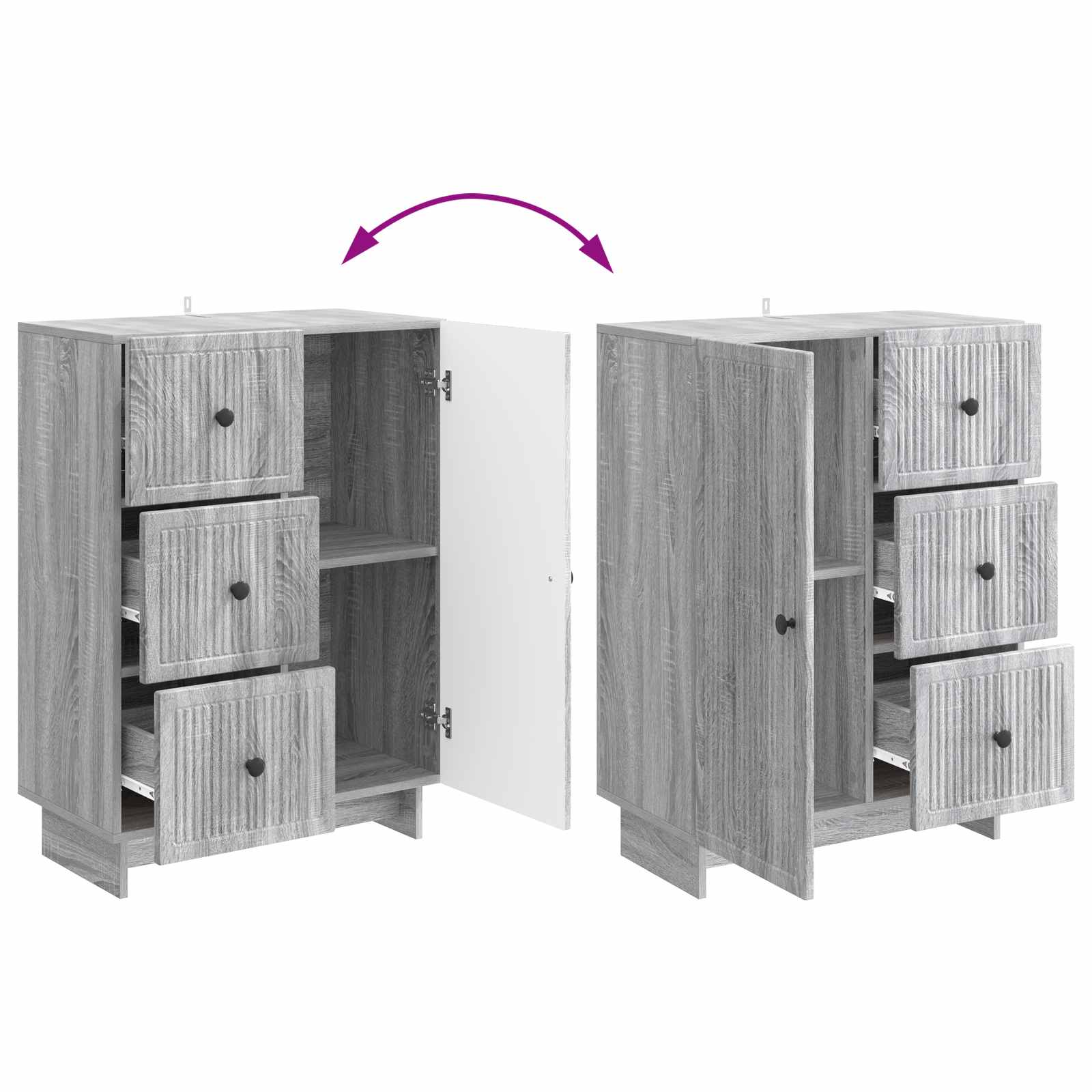 • 90° keinusaranaovet: Sivupöydässä on 90° avautuvat keinusaranaovet, jotka tarjoavat suoran pääsyn sisätiloihin. Tämä malli on käytännöllinen, ja se toimii hyvin, kun tarvitset ruokailuvälineitä tai järjestät olohuoneen sisustusta.