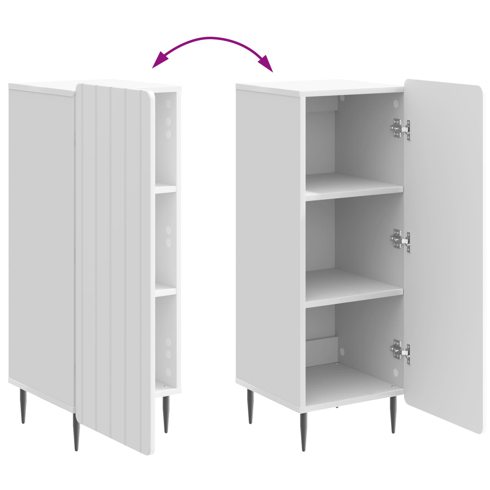 • Toiminnalliset osat Varustettu hyllyillä, mikä mahdollistaa erilaisten yksityiskohtien säilyttämisen. Teräksiset jalat tukevat hyvin ja antavat muotoon modernin ilmeen. Kehykseen yhdistetyt 90° keinusaranaovet tekevät pääsystä tavaroihin vaivatonta.