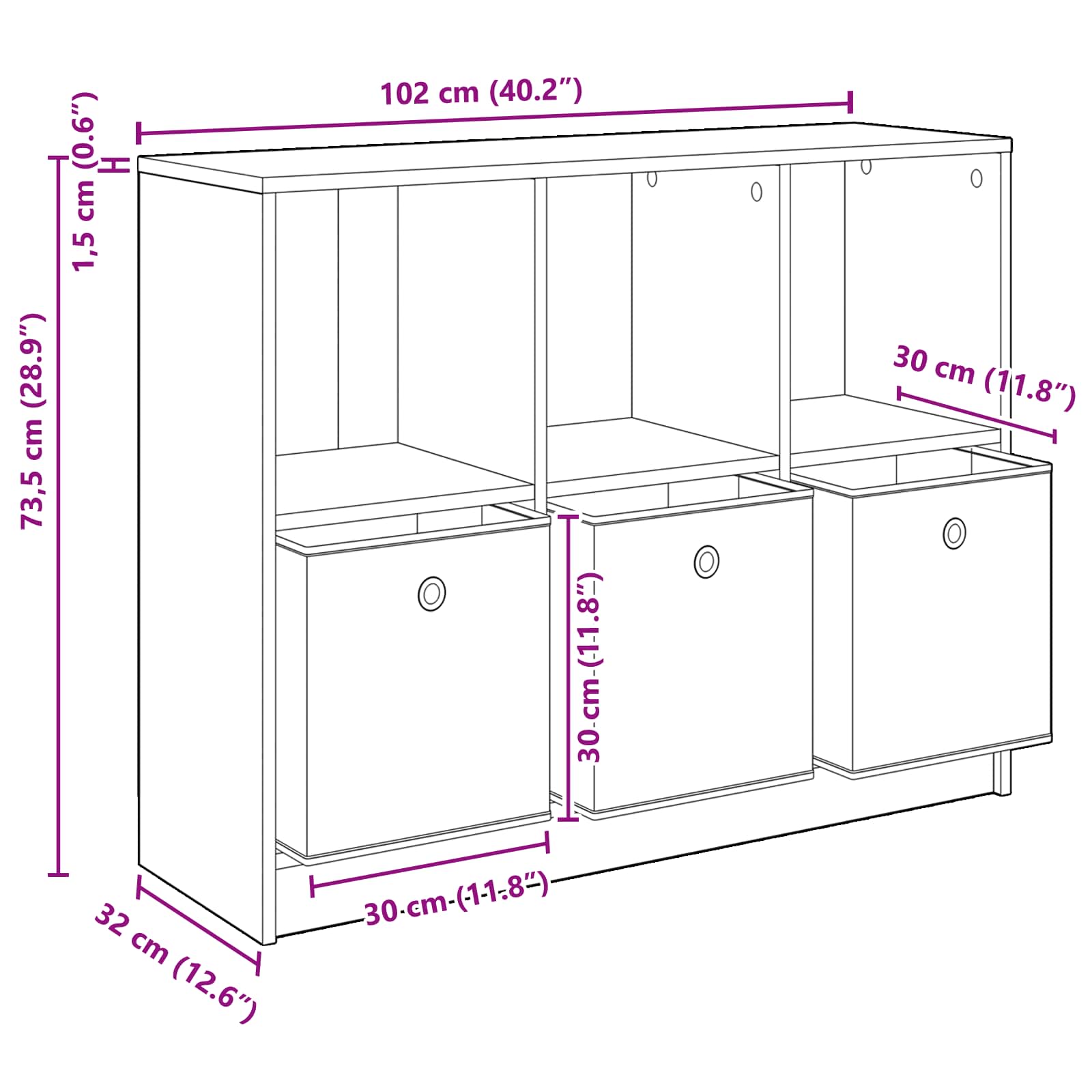 • Yleiset mitat: 102 x 32 x 73,5 cm (L x S x K)