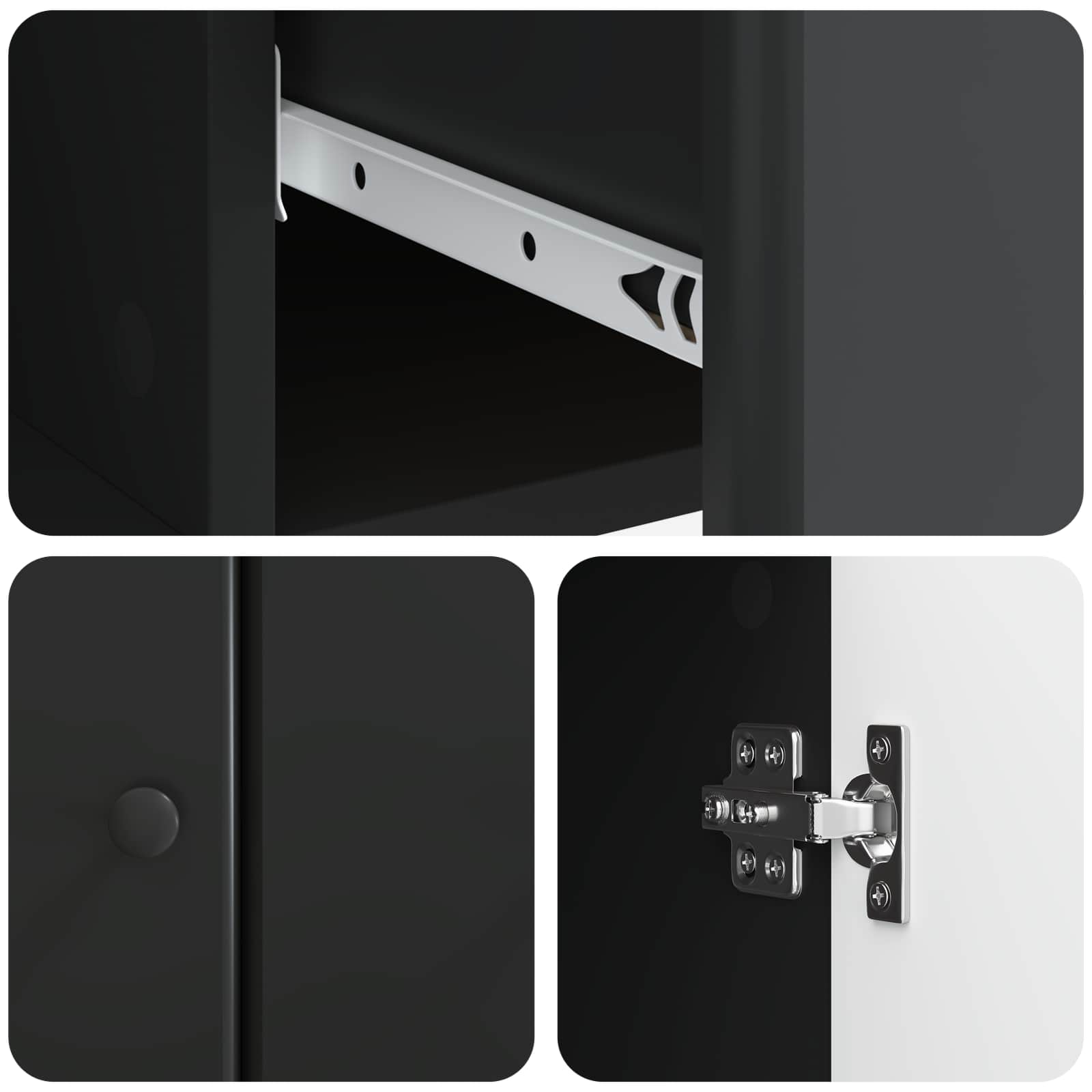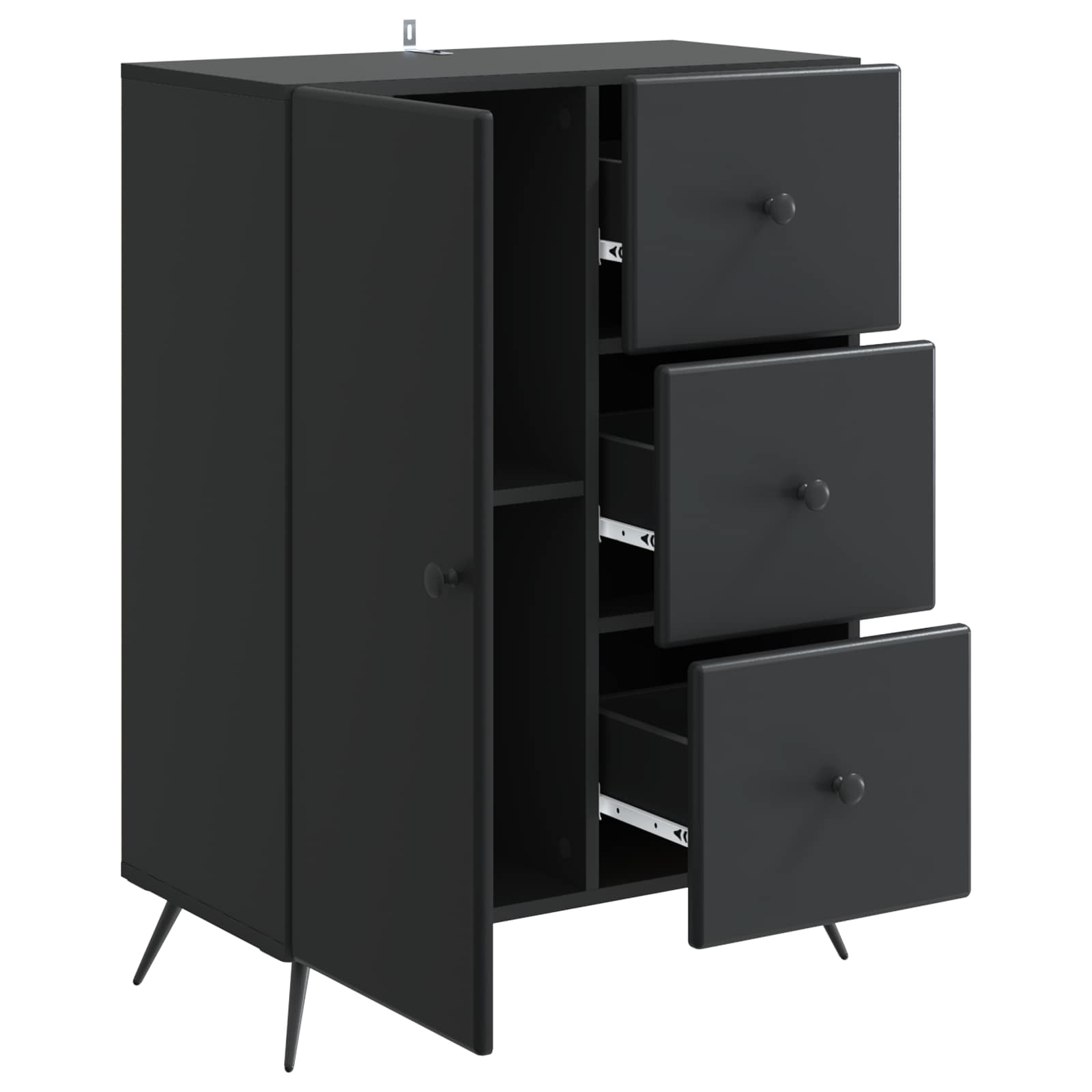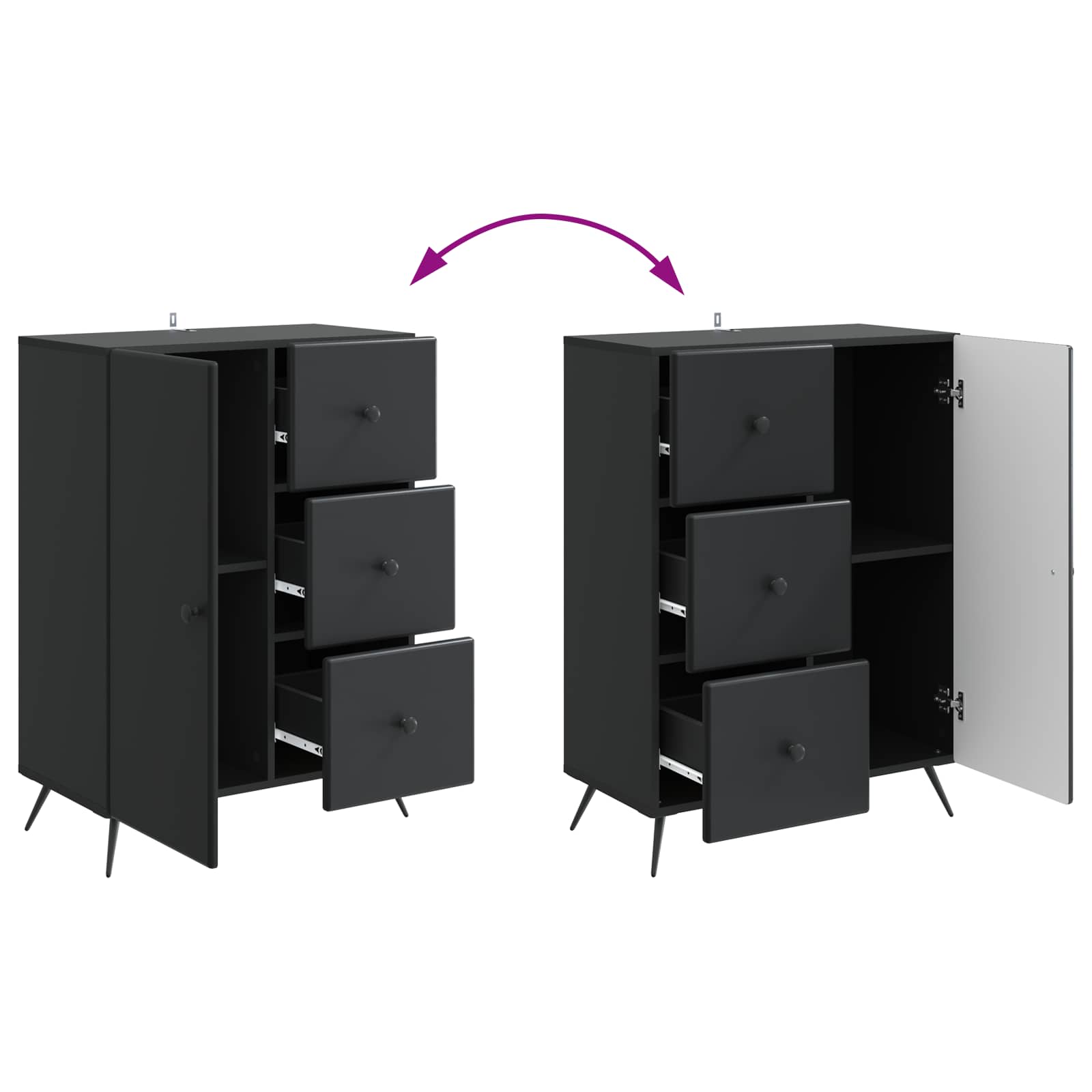 • Runsas säilytystila Tässä kalusteessa on paljon tilaa, kiitos avarien lokeroiden ja laatikoiden. Hyllyt ja laatikot pitävät tavarat järjestyksessä, olipa kyse sitten ruokailuvälineistä, elektroniikasta tai toimistotarvikkeista, ja vähentävät näin sotkua.
