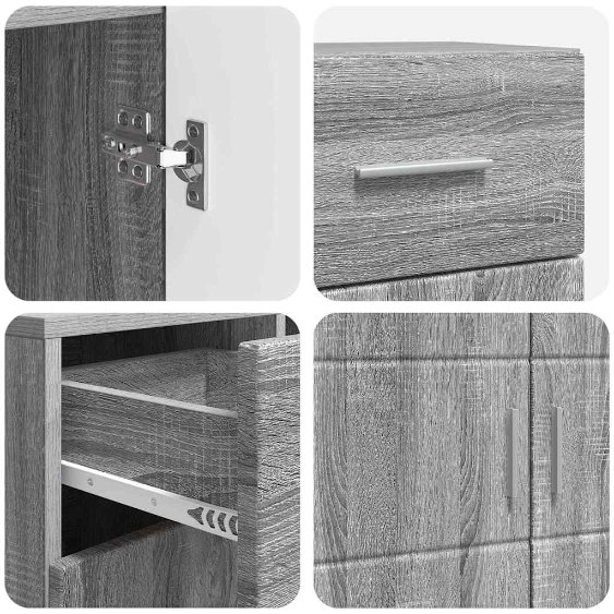 • Tekninen Puu Rakenteena: Tämä kaappi on valmistettu huippuluokan teknisestä puusta, joka on tunnettu kestävyydestään ja monipuolisuudestaan. Tämä materiaali on pitkäikäistä ja tuo kehittynyttä, modernia ilmettä, joka sulautuu helposti mihin tahansa sisustukseen.