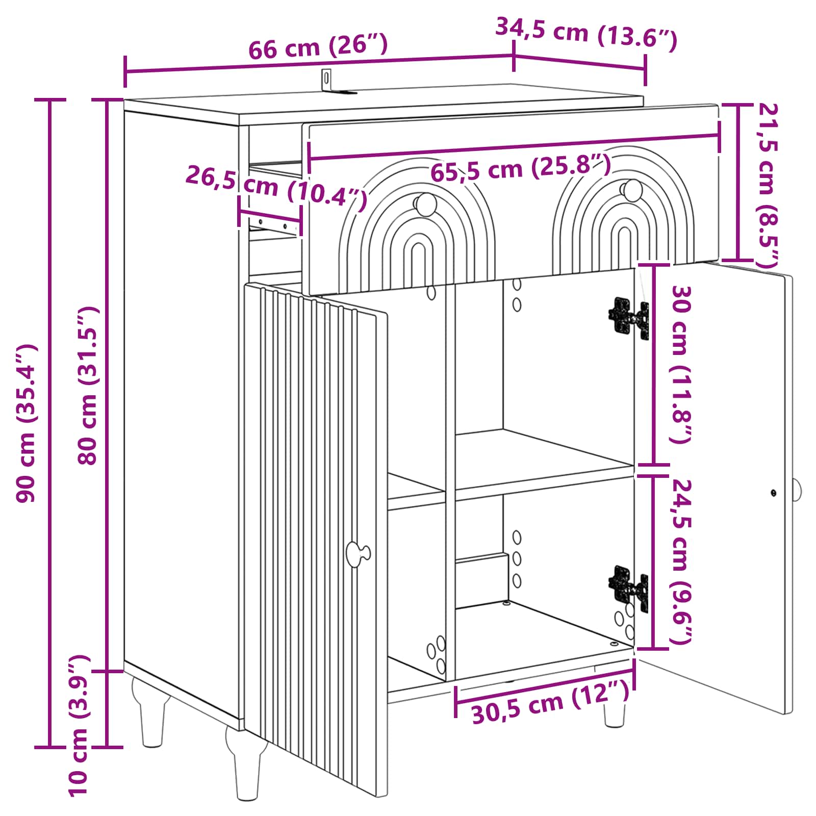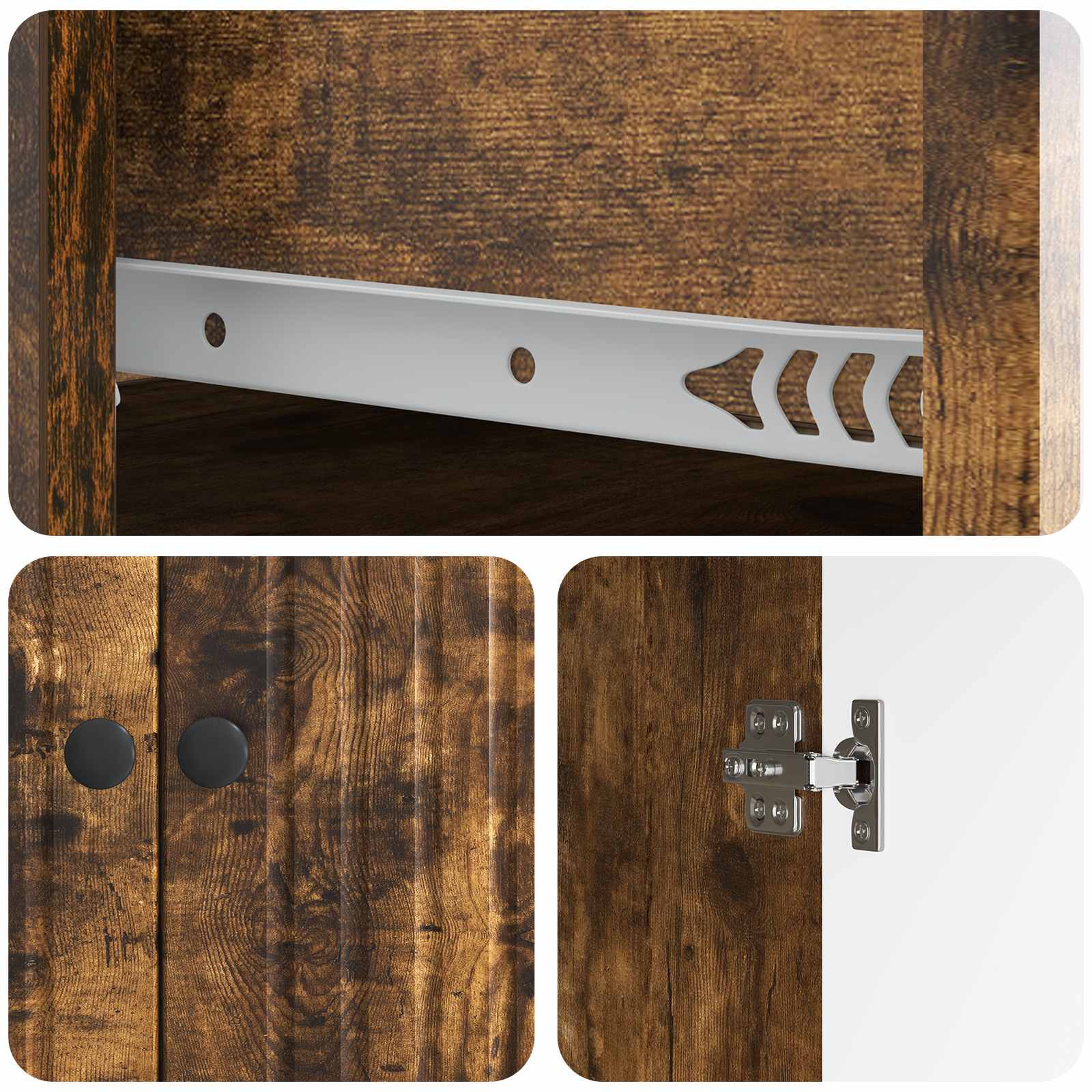 • Huolto & Ylläpito: Tämän kaapin hoitaminen on helppoa. Pyyhi se vain kostealla liinalla, niin säilytät sen hyvänä, ja se pysyy tyylikkäänä vuosien käytön jälkeen. Teknisen puun viimeistely on kosteudenkestävä ja tahroilta suojattu, tarjoten kestävän ja hienostuneen pinnan.