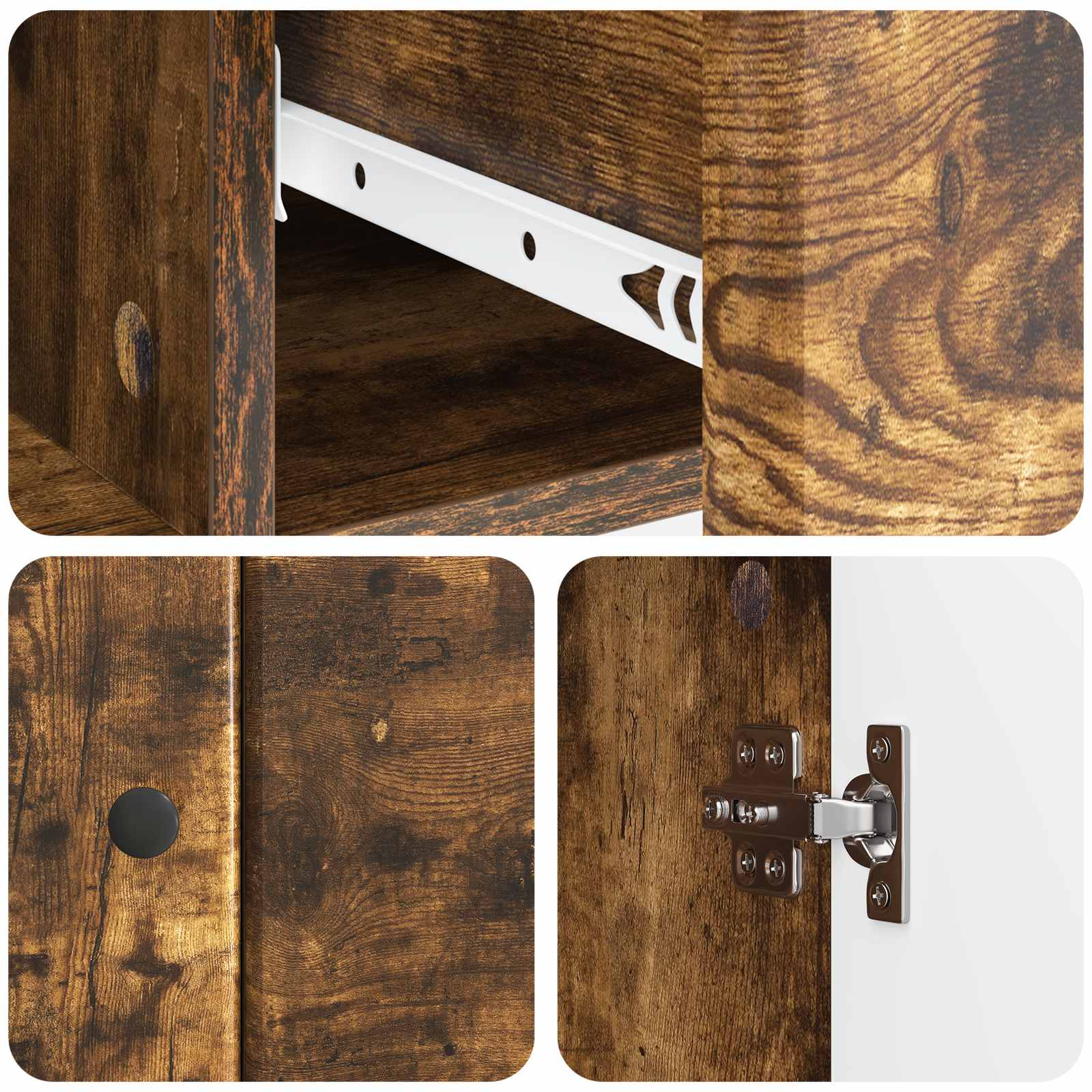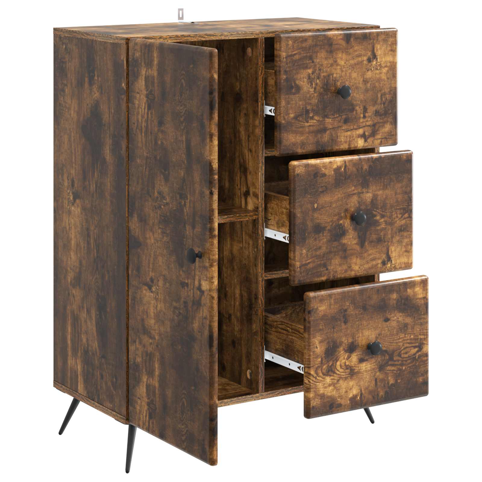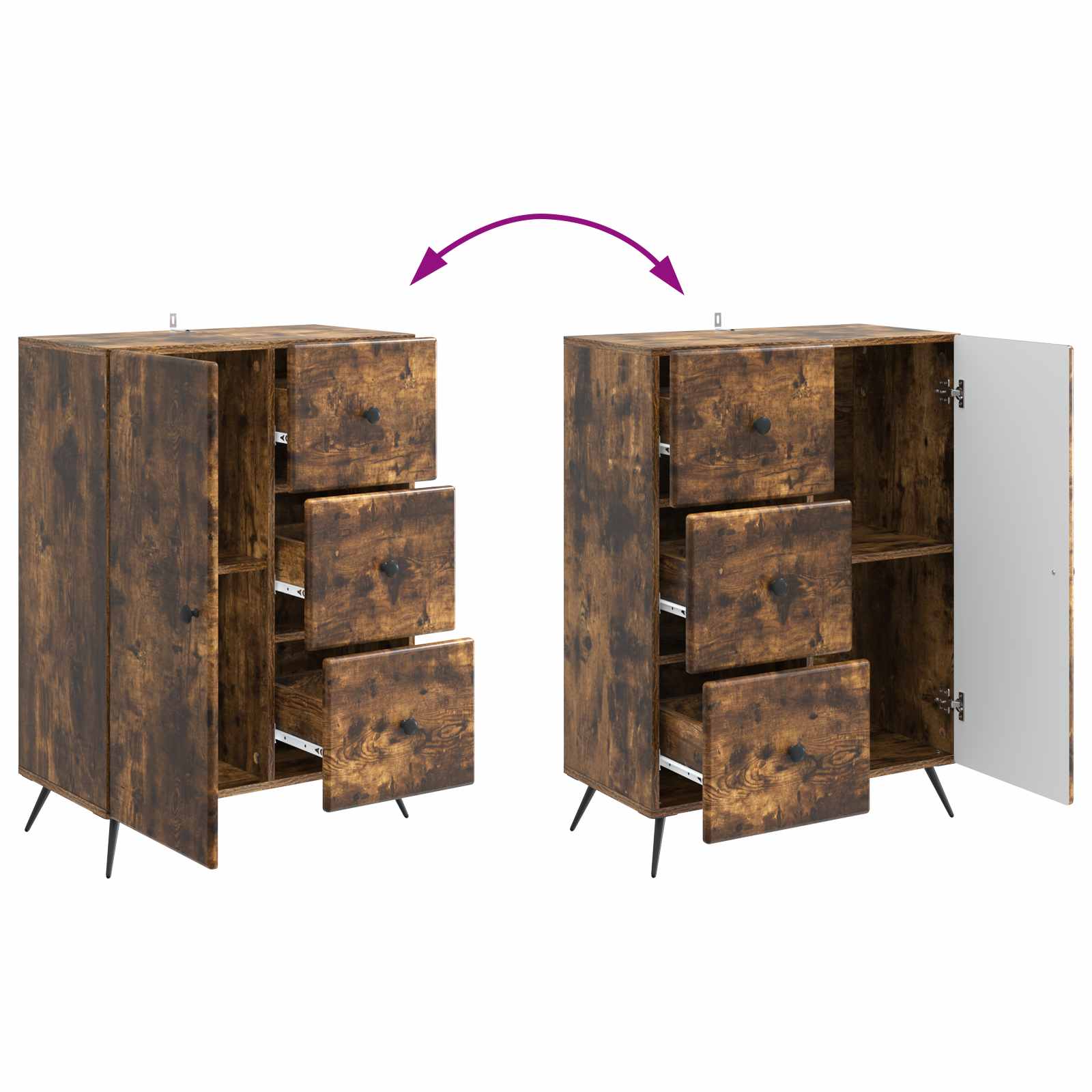 • Runsas säilytystila Tässä kalusteessa on paljon tilaa, kiitos avarien lokeroiden ja laatikoiden. Hyllyt ja laatikot pitävät tavarat järjestyksessä, olipa kyse sitten ruokailuvälineistä, elektroniikasta tai toimistotarvikkeista, ja vähentävät näin sotkua.