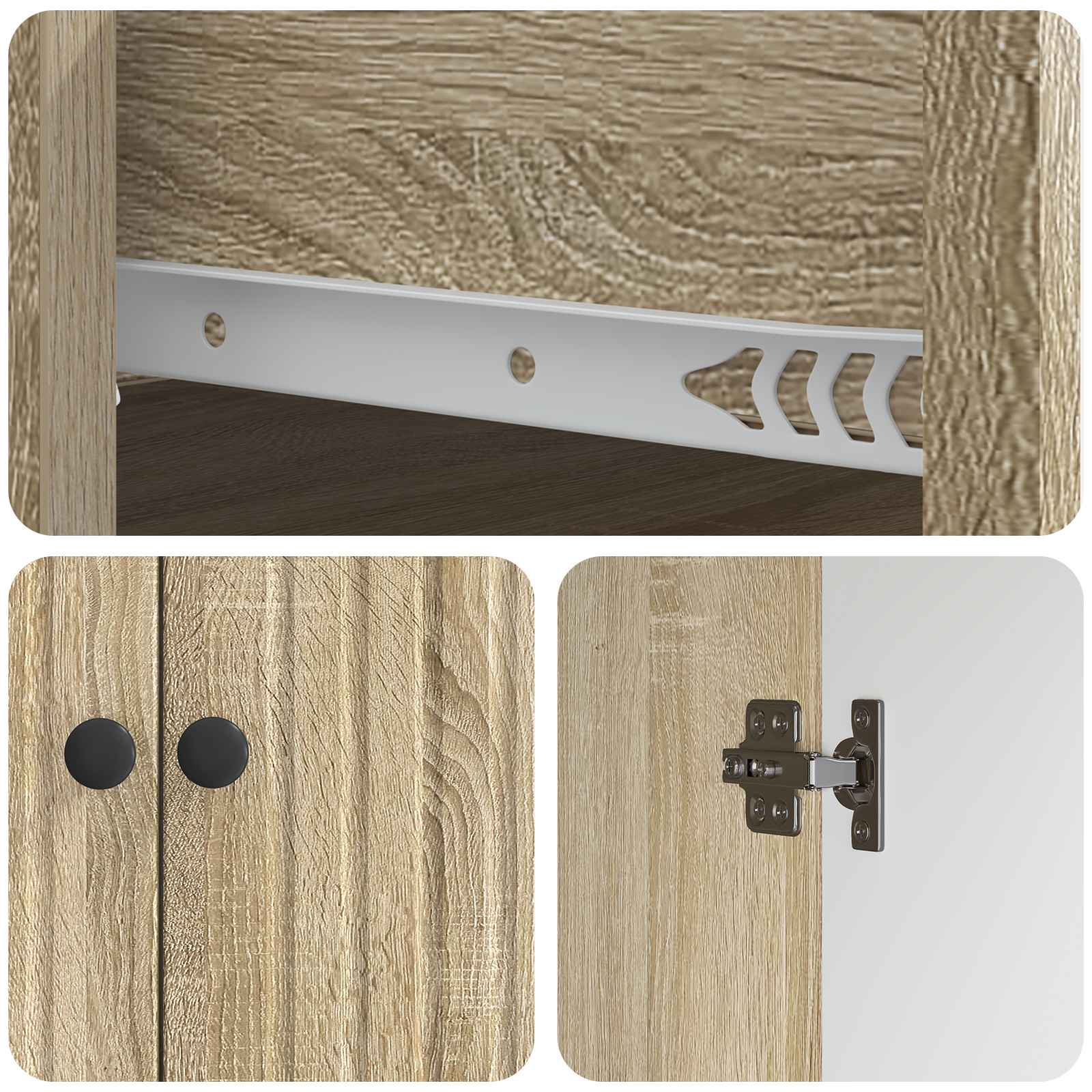 • Huolto & Ylläpito: Tämän kaapin hoitaminen on helppoa. Pyyhi se vain kostealla liinalla, niin säilytät sen hyvänä, ja se pysyy tyylikkäänä vuosien käytön jälkeen. Teknisen puun viimeistely on kosteudenkestävä ja tahroilta suojattu, tarjoten kestävän ja hienostuneen pinnan.