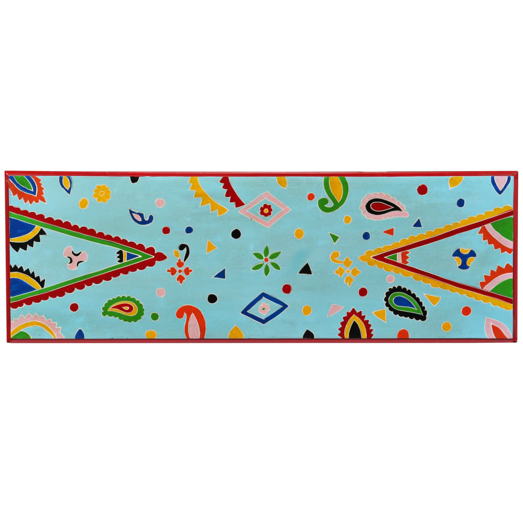 Pöytä on valmistettu käsin mangopuusta, joka on sekä kestävä että kaunis materiaali, käsityötaito korostaa sen mahtavaa retrotyyliä. Pöydässä on täyteläinen käsinmaalattu koristekuvio, joka huokuu eleganssia ja korostaa tuotteen hienostunutta ulkonäköä. Omalaatuiset kahvat tekevät vetolaatikon avaamisesta helppoa ja lisäävät sen tyyliä.