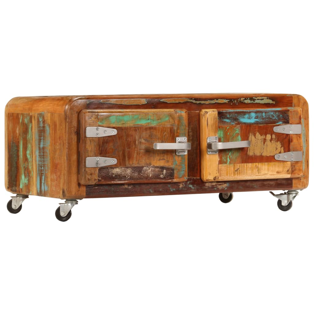 Sohvapöytä on valmistettu kiinteästä kierrätetystä puusta, joka on kerätty vanhojen purkamiseen päätyneiden talojen pylväistä, lattioista ja tukipalkeista. Se voi siten koostua monista eri puulajeista, kuten männystä, tiikistä, pyökistä, tammesta, setripuusta, mangopuusta, akaasiapuusta jne. Tämä tarkoittaa sitä, että kierrätyspuussa on kaikkien eri puulajien ominaisuuksia. Kierrätetty puu on jo vanhentunutta, kulunutta ja kuivunutta, joten se ei kutistu eikä taivu. Sohvapöytä on täysin käsintehty ja puun hienostuneet pintakuviot tekevät jokaisesta huonekalusta ainutlaatuisen ja hieman toisistaan poikkeavan. Tässä sivupöydässä on 2 kaappia, joissa on ovet. Niissä on runsaasti tilaa multimedialaitteiden, kirjojen ja muiden esineiden säilyttämiseen. Pöydässä on 4 pyörää, joten sitä on helppo liikuttaa.