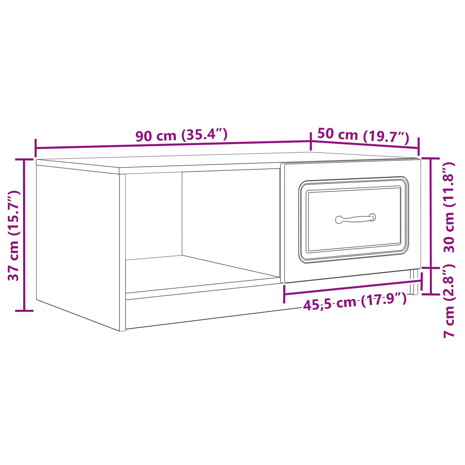• Runsaasti säilytystilaa: Suunniteltu siistimistä ja järjestämistä varten, tämä pöytä tarjoaa runsaasti säilytystilaa, jotta tavarat pysyvät järjestyksessä ja olohuoneesi on käytännöllinen.
