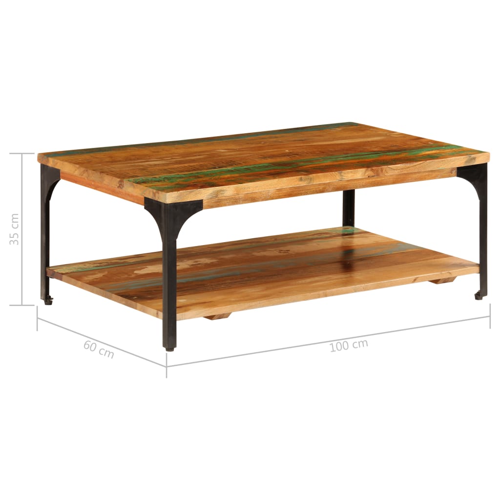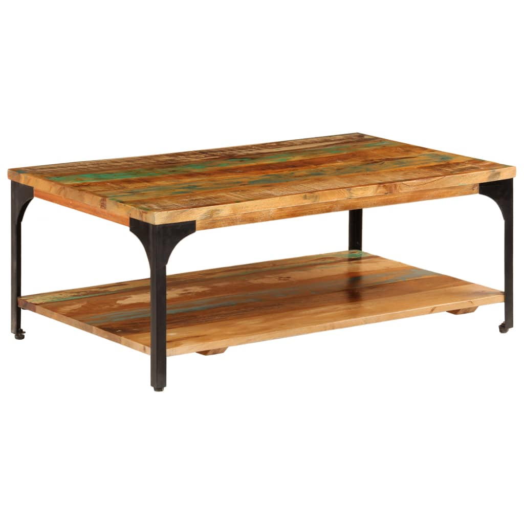 Tämä pöytä on valmistettu täydestä kierrätyspuusta ja jauhemaalatusta teräksestä, joten se on tukeva ja kestävä. Kierrätetty puu on hankittu purettavien vanhojen rakennusten palkeista, lattioista ja tukirakenteista. Se voi koostua erityyppisistä puista, kuten mänty, tiikki, pyökki, tammi, setri, mangopuu, akaasiapuu jne. mikä tarkoittaa, että kierrätetty puu säilyttää näiden erityyppisten puulajien ominaisuudet. Kierrätetty puu on jo vanhaa ja kuivaa, joten se ei enää kutistu tai taivu. Jokainen valmistusprosessin vaihe suoritetaan erittäin huolellisesti, olipa kyse sitten kiillotuksesta, maalaamisesta tai lakkaamisesta. Käsityötaito ja esteettisesti houkuttelevat puukuviot tekevät jokaisesta sohvapöydästä hieman erilaisen. Pöytätason alla olevan hyllyn ansiosta voit säilyttää kätevästi kirjoja, kuppeja ja muita tavaroita. Kokoaminen on helppoa.