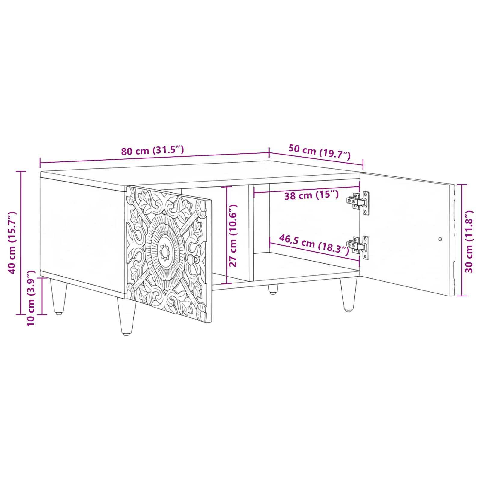 • Suositellut käyttötarkoitukset: Suunniteltu sisätiloihin, tämä kahvipöytä tuo tyyliä olohuoneeseen. Sen muotoilu tekee siitä loistavan valinnan, jos rakastat kauniita huonekaluja. Pöydän koko sopii moniin käyttötarkoituksiin, kuten juomien tarjoamiseen tai koristeluun.