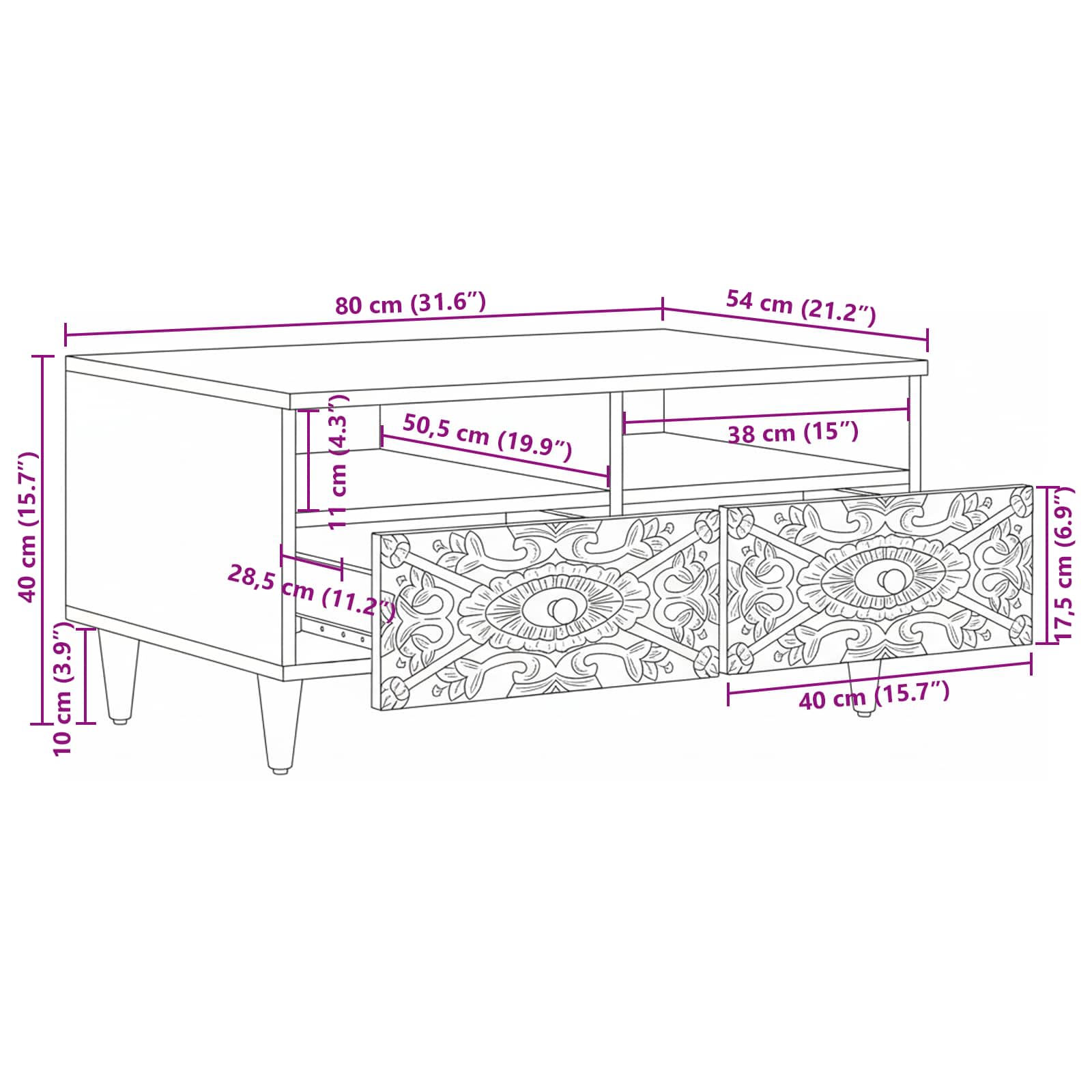• Koko ja mitat: Pöydän mitat ovat 80 x 54 x 40 cm, mikä tekee siitä sopivan olohuoneeseesi, tarjoten runsaasti tilaa ilman liiallista hallintaa sisustuksessa. Se on aina oikein kokoa moniin käyttötarkoituksiin, aina pienistä kokoontumisista suurempien huonekalujen täydentämiseen.